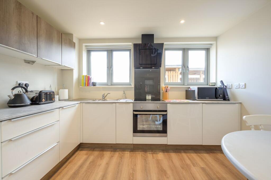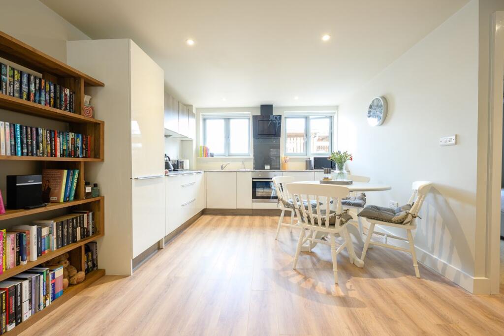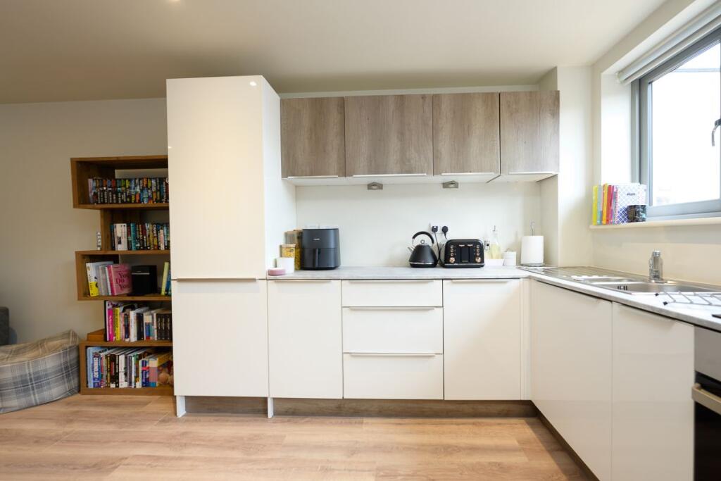 A well-presented one-bedroom ground floor apartment with its own private entrance, located on the edge of Ross-on-Wye town centre. The property features a spacious hallway, bright open-plan kitchen/living area with integrated appliances, a double bedroom, modern bathroom, and utility cupboard.