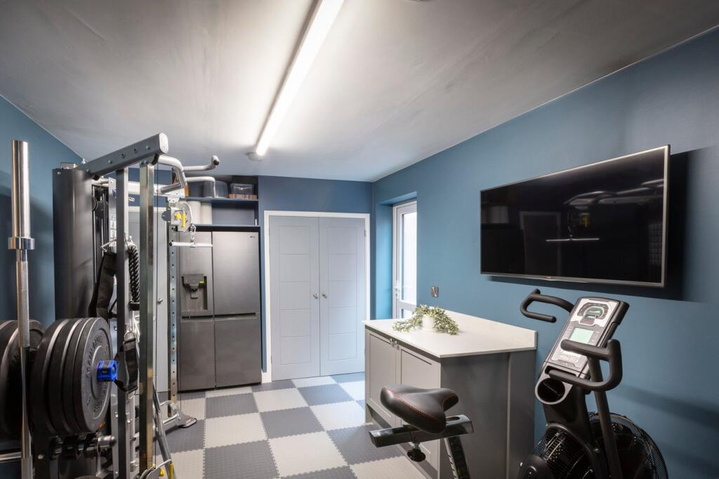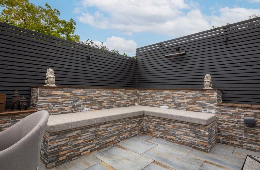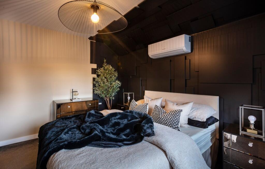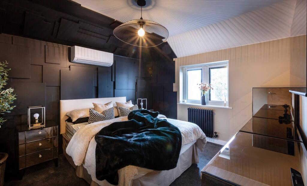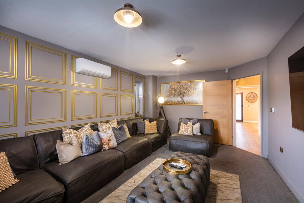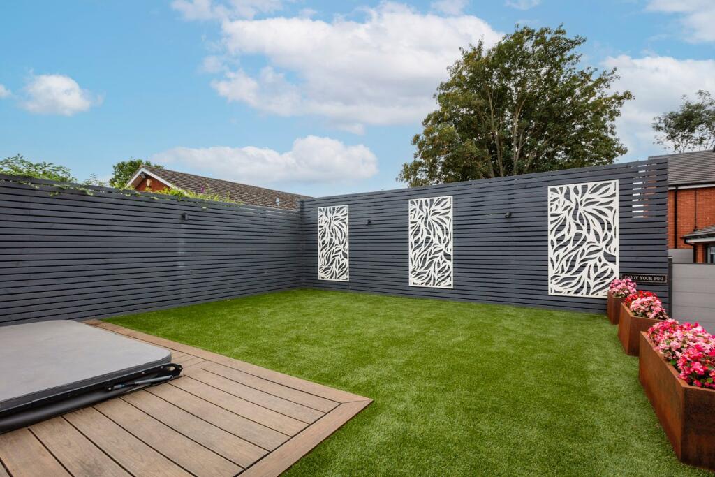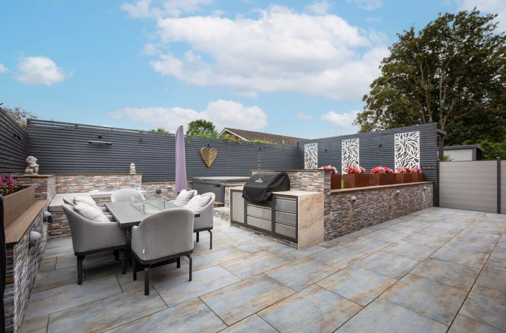 A modern detached property in Shefford, Bedfordshire. The property is well-located near schools and transportation. The interior is modern and well-maintained, and the exterior features a landscaped garden with a patio and hot tub.