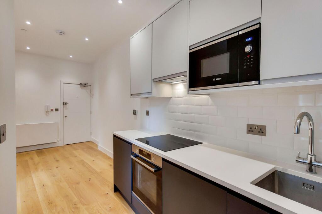 This beautifully presented one-bedroom flat offers an exceptional standard of modern living with a thoughtfully designed layout. The sleek, contemporary kitchen is a true highlight, featuring integrated appliances, modern units, and a stylish subway tile backsplash.