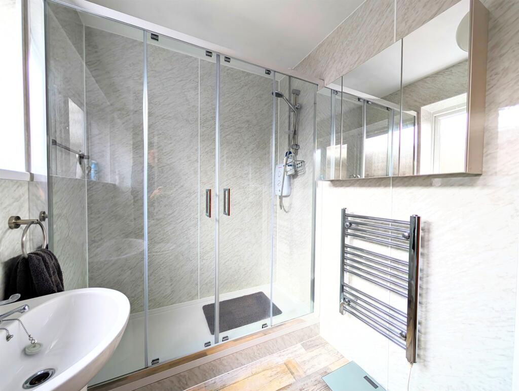 The property appears to be in good condition based on the provided images. The interior is well-maintained and presented, with modern fixtures and fittings in the bathroom. The kitchen appears functional, though possibly dated in style. There is evidence of a conservatory and a garden, suggesting additional living space and outdoor area.