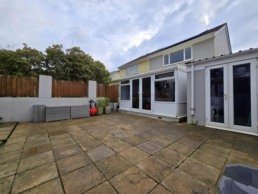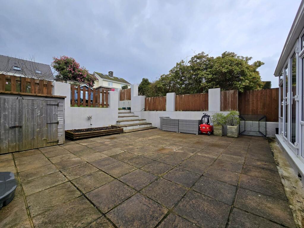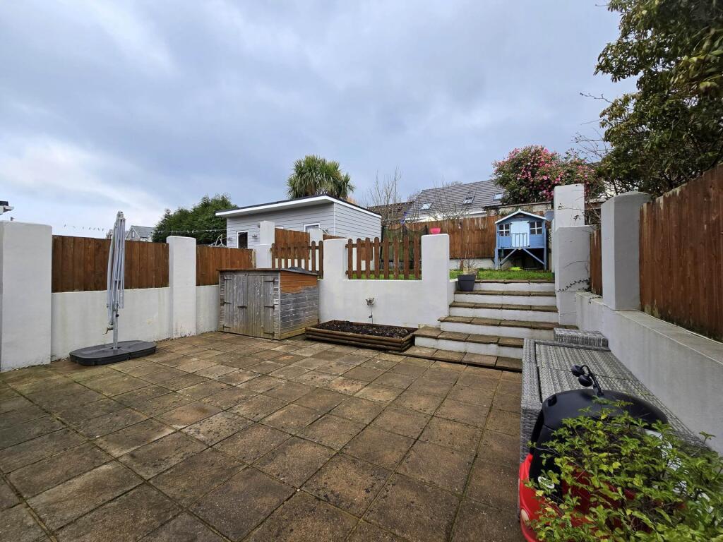 The property has a garden, which is a significant positive. The garden is relatively small but appears usable and well-maintained. It includes paved patio areas, a lawn, and some outbuildings.