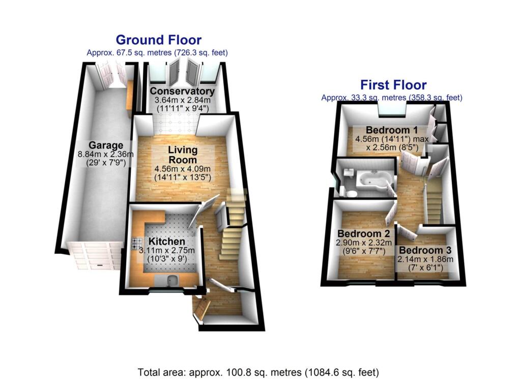 The property is a 3-bedroom house located on Burwood Road in Great Torrington, Devon. It has a total area of 1084.6 sq ft and sits on a plot of 1085 sq ft. The list price is £250,000.