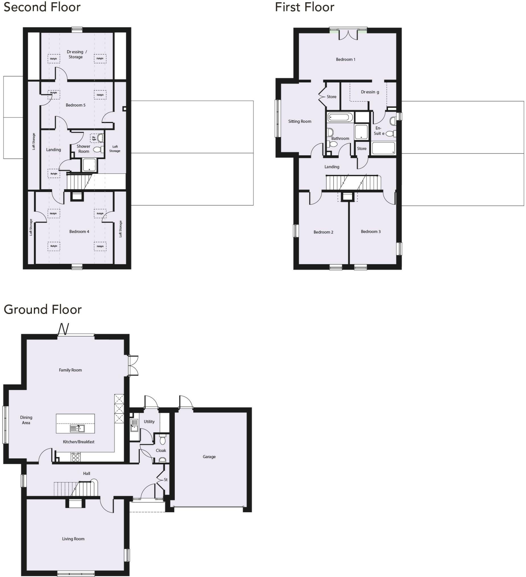 Three storey, five bedroom detached house, with an open plan kitchen, dining, and family room with an island in the kitchen. Separate living room with alcove for fireplace. Garage and parking for three vehicles is included.