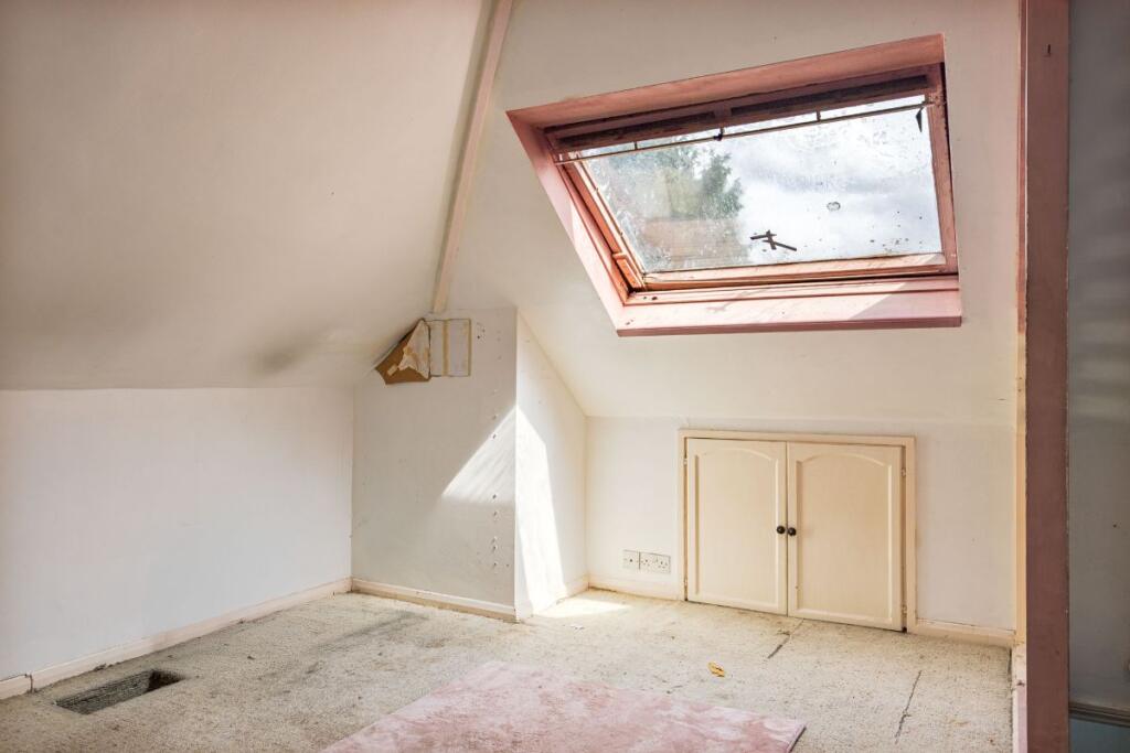 Chain-free 3-bedroom semi with 4th 'bedroom' in loft, needs refurbishment. Huge garage at rear with parking inside for 3 cars. Kitchen quite modern actually with new boiler; bathroom still has original 1930s tiles.