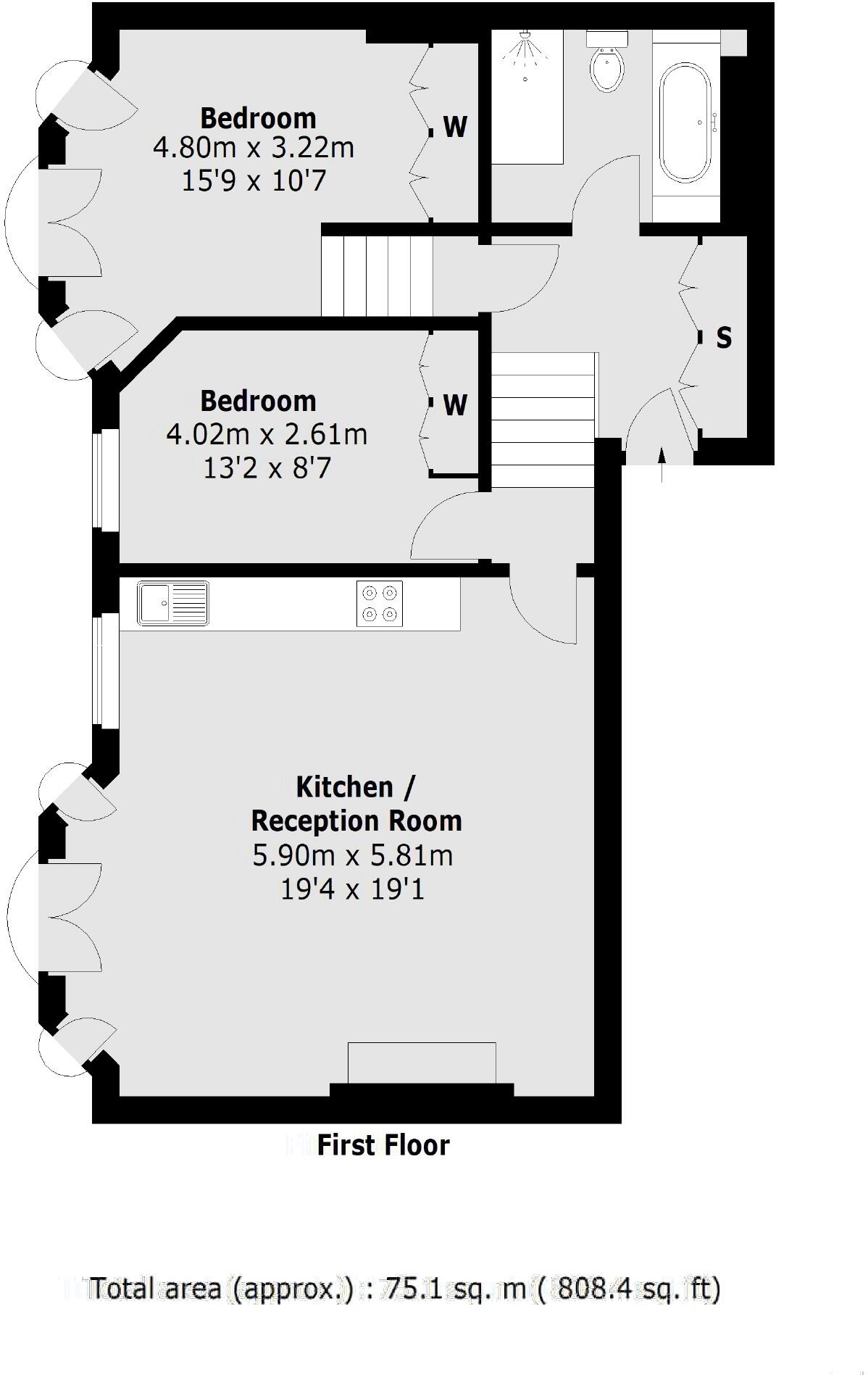 A first floor apartment with high ceilings and two Juliet balconies. This property has two bedrooms, one bathroom and is in great condition throughout.