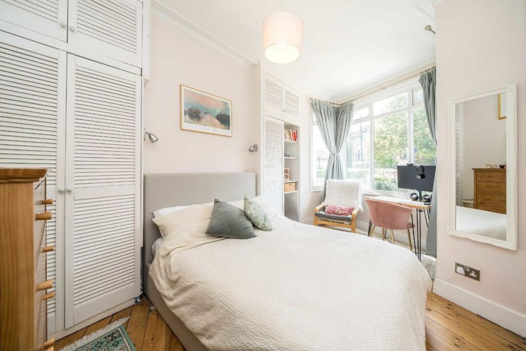 A well-presented ground floor one-bedroom flat offered chain free with the benefit of a share of freehold. The property features a spacious reception room, a separate kitchen with direct access to the rear garden, a generous double bedroom with built-in wardrobes, and its own front garden.