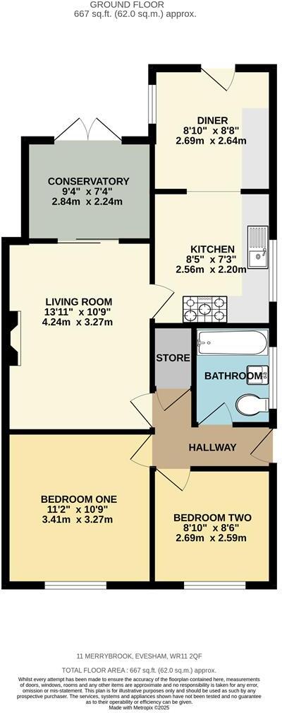 The property is a semi-detached bungalow located in Merrybrook, Evesham, Worcestershire. It has two bedrooms, one bathroom, and a total area of 607.47 sqft. The plot size is 667 sqft. The list price is £315,000. The property appears to be in good condition, with a modern kitchen and a recently added conservatory. The garden is well-maintained and of a reasonable size. The average house price in the area is £324,495, with an average price per sqft of £238. However, the average sqft for properties in the area is significantly larger at 1,360 sqft compared to this property’s 607.47 sqft. Nearby comparable properties on Merrybrook range from £150,000 to £235,000 for semi-detached properties. Given the smaller size of the property and the lower prices of comparable properties on the same street, the list price of £315,000 may be considered slightly high. However, the modern updates to the kitchen and the addition of the conservatory could justify a higher price compared to other properties on Merrybrook that may require more renovation. The location is close to a number of schools with good Ofsted ratings, and Evesham train station is within a reasonable distance. This makes the location desirable for families.