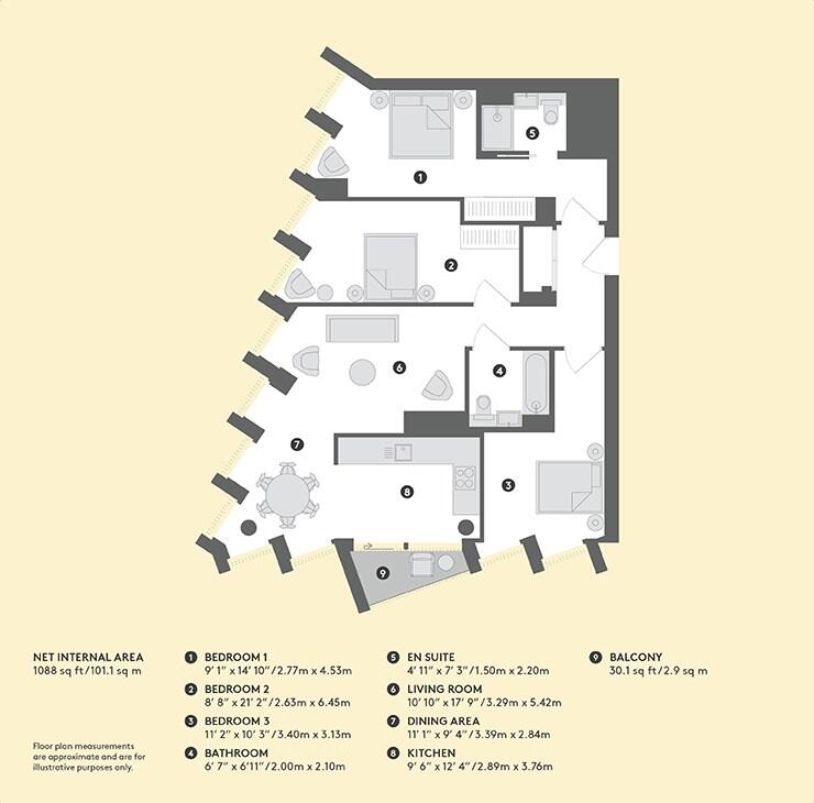 A luxury and ultra-modern three-bedroom, two-bathroom apartment situated in Building 5, Upper Riverside. Complete with residents' swimming pool, gyms, cinema and more.