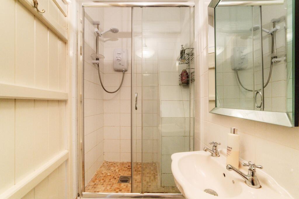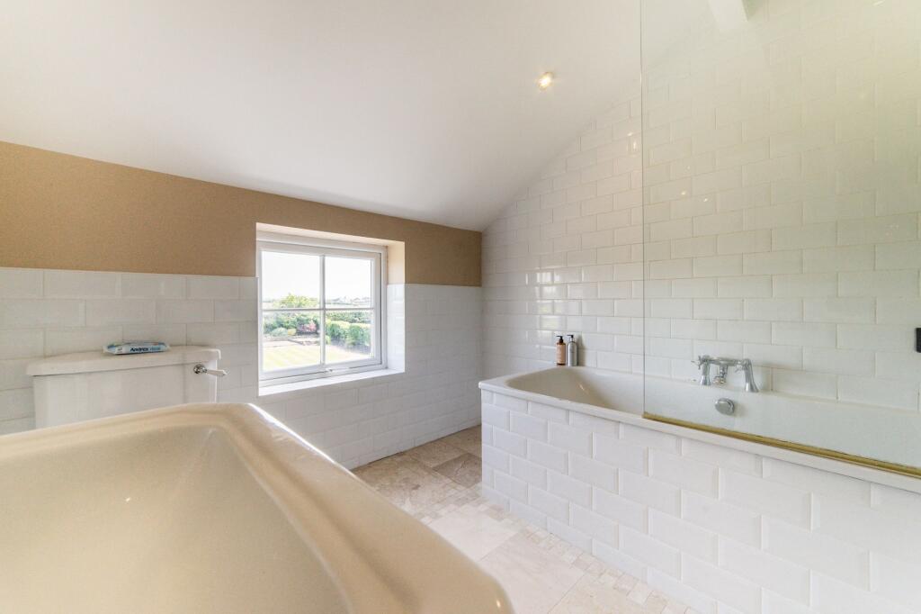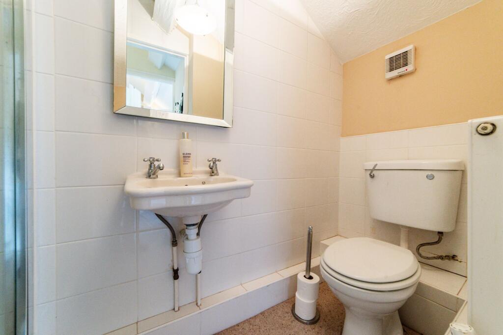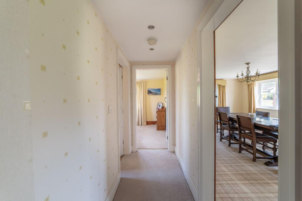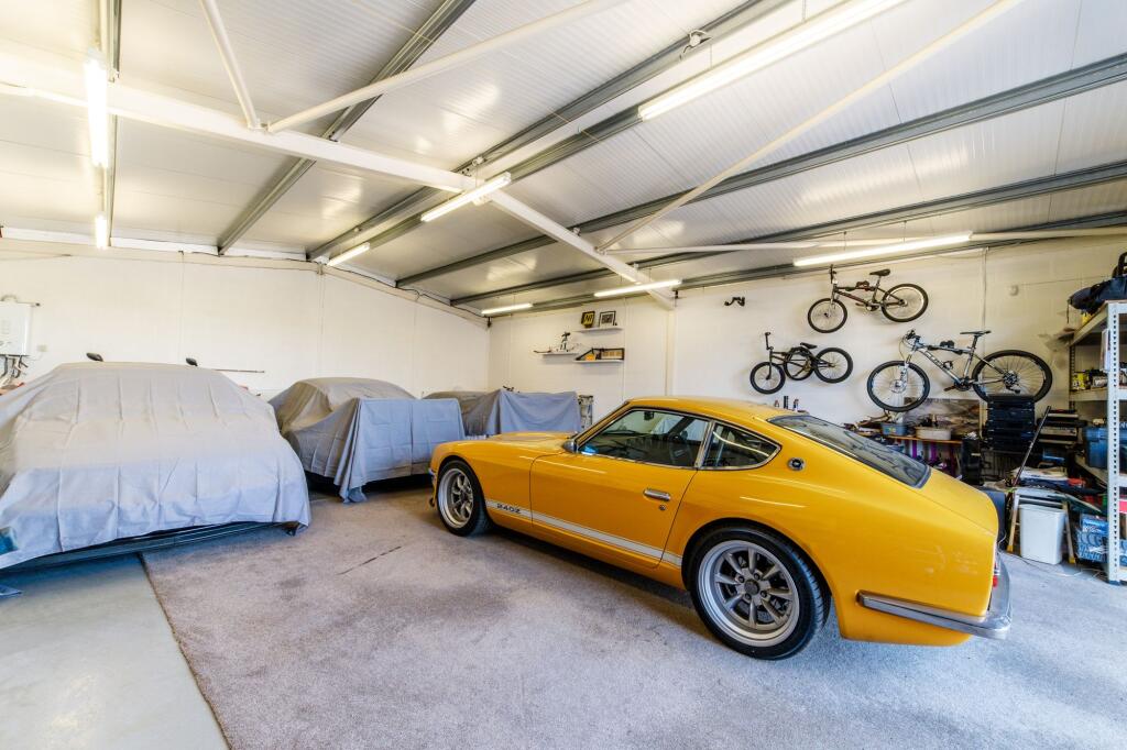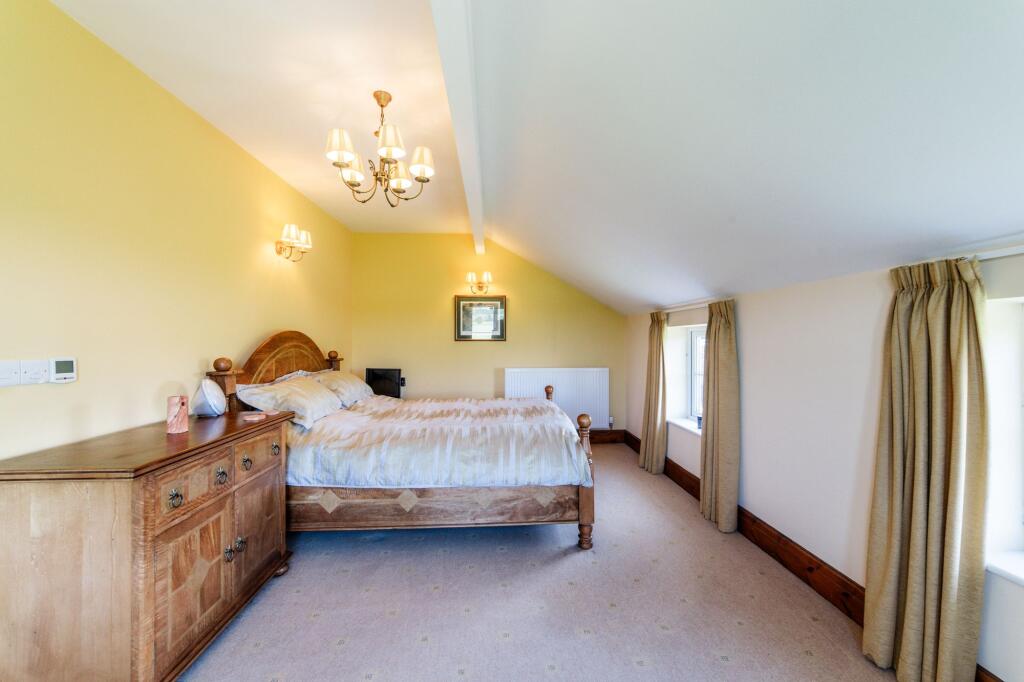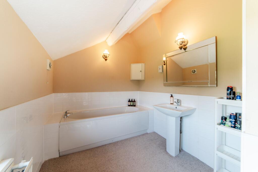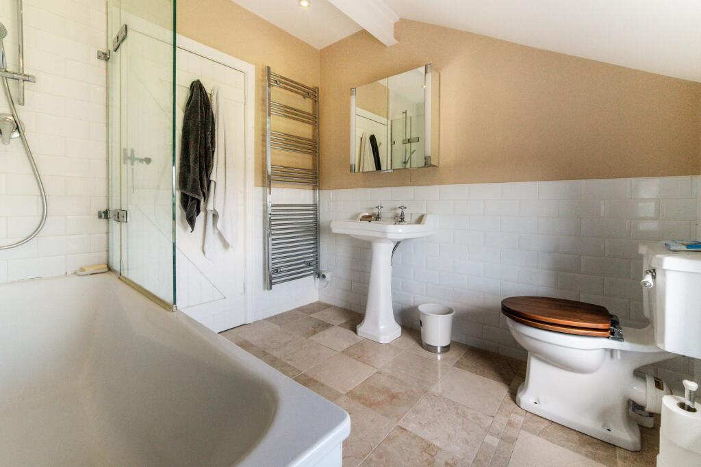 A substantial detached property with five bedrooms and three bathrooms, suitable for a large family. The property is in good condition, with well-maintained interiors and exteriors, retaining its period charm with exposed beams and traditional fireplaces. It benefits from a significant amount of land, including a well-manicured garden and additional outbuildings, including garages and a large shed. Unusually, the property also features a skate park.