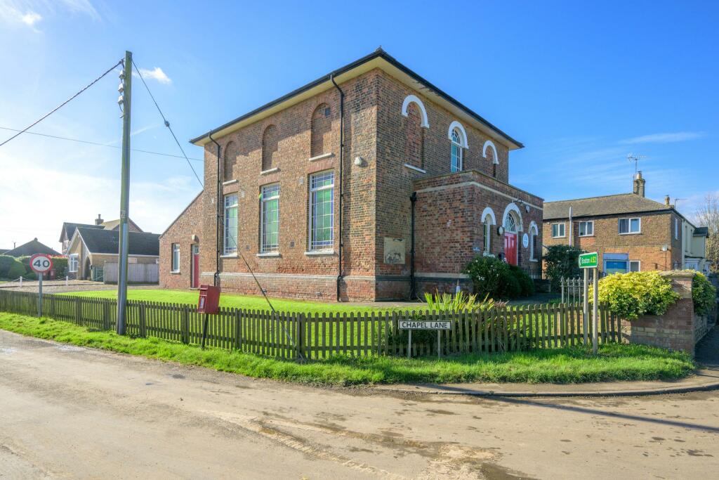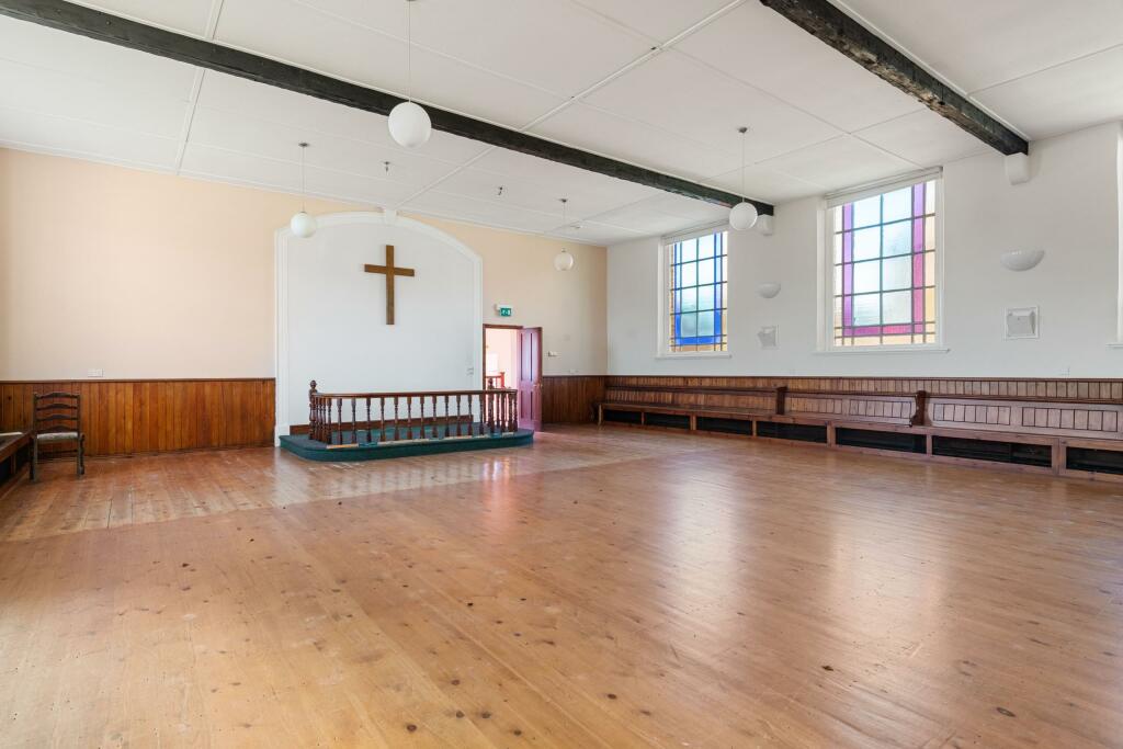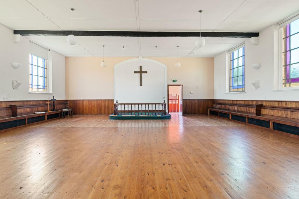This property is a Grade II listed former Methodist Church situated in Wrangle, Lincolnshire. It is being sold via online auction with a starting bid of £100,000. The property is described as being on a good sized corner plot, a significant advantage in a village setting. The interior features a large, open main space with original wooden panelling and flooring, suggesting a spacious area for conversion and adaptation. There is a small kitchen which appears to be in reasonable condition, in need of only minor renovation. The images also reveal stained-glass windows and exposed beams, adding potential character to the renovated property. It is important to consider that the property lacks bathrooms and bedrooms, and will require significant conversion and renovation to transform it into a habitable residence. The relatively low starting price may reflect this requirement and the inherent risks of purchasing an auction property. Nearby properties are mostly detached bungalows, indicating this property is a unique conversion opportunity. There is a primary school within easy reach which is beneficial for families. The lack of detailed information on amenities and transportation limits a full evaluation. A survey is strongly recommended before bidding.