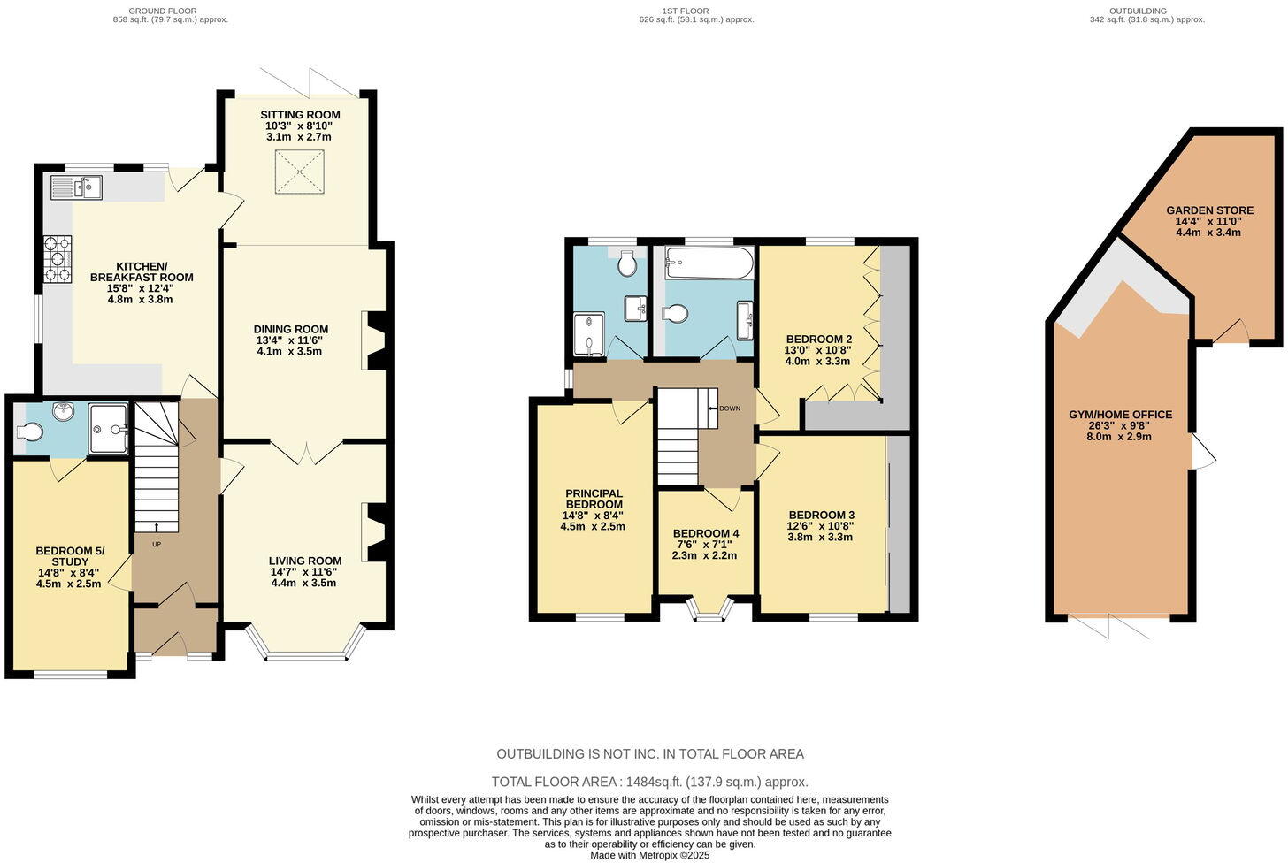 The interior photographs showcase a well-maintained property with a modern kitchen and bathrooms. The design scheme is neat and tidy with a consistent color scheme and flooring. The multiple living spaces indicate suitability for a family. The inclusion of a separate garden gym adds a significant bonus for potential buyers.