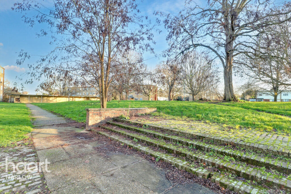 This is a two-bedroom flat in Harlow, Essex. The property appears to be in generally good condition, with a modern kitchen and bathroom. The location offers proximity to schools and transportation. The asking price of £180,000 seems reasonable compared to the average property price in the area. While the flat itself offers limited land, there is communal green space surrounding the building.