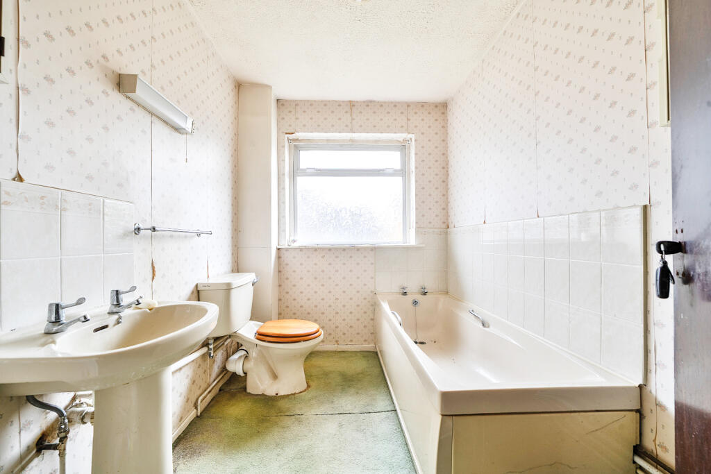 This is a detached bungalow in Kidderminster. The property requires renovation but offers three bedrooms, one bathroom, and a garden. It also features a garage. The location is convenient, with schools and transportation nearby. The asking price is £300,000.