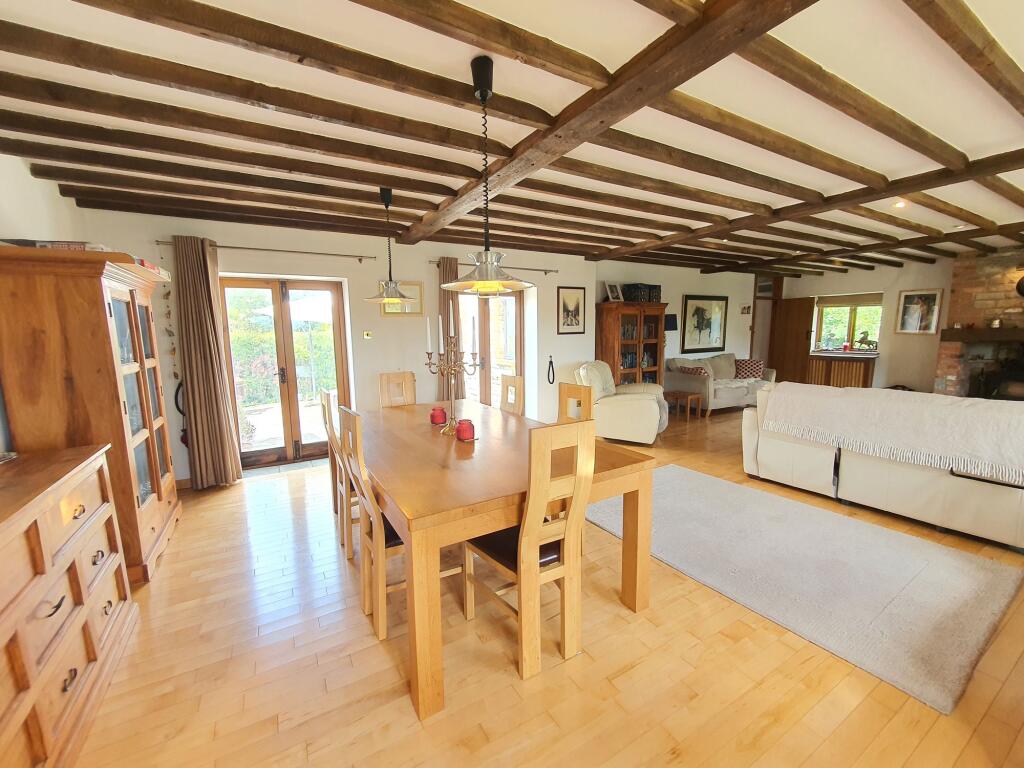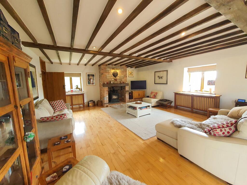 A superb single storey, 4 bedroom barn conversion (converted c. 1999 and constructed of traditional stone with a tiled roof and timber framed windows) with the benefit of a magnificent 35ft reception room, double garage and garden backing onto open farmland with fine views. The spacious accom...