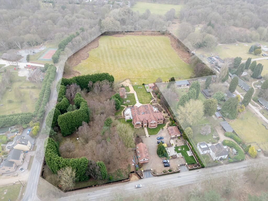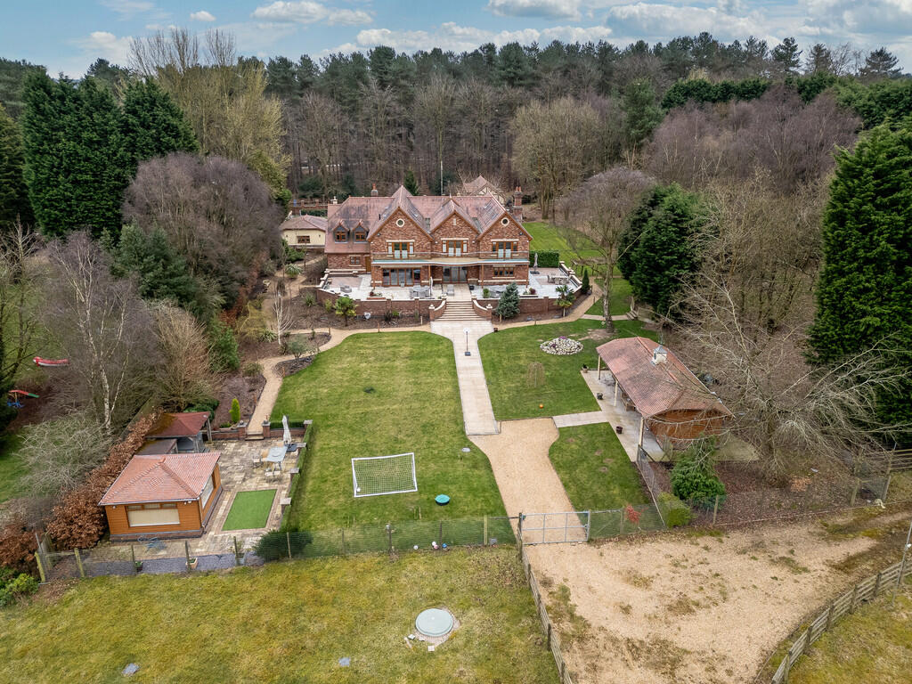 The property boasts a significant plot size, as evidenced by the aerial images. The extensive gardens and grounds contribute to a high land score. The presence of mature trees and landscaping suggests a well-established and private setting.