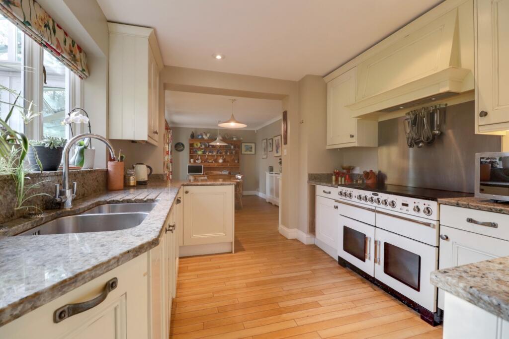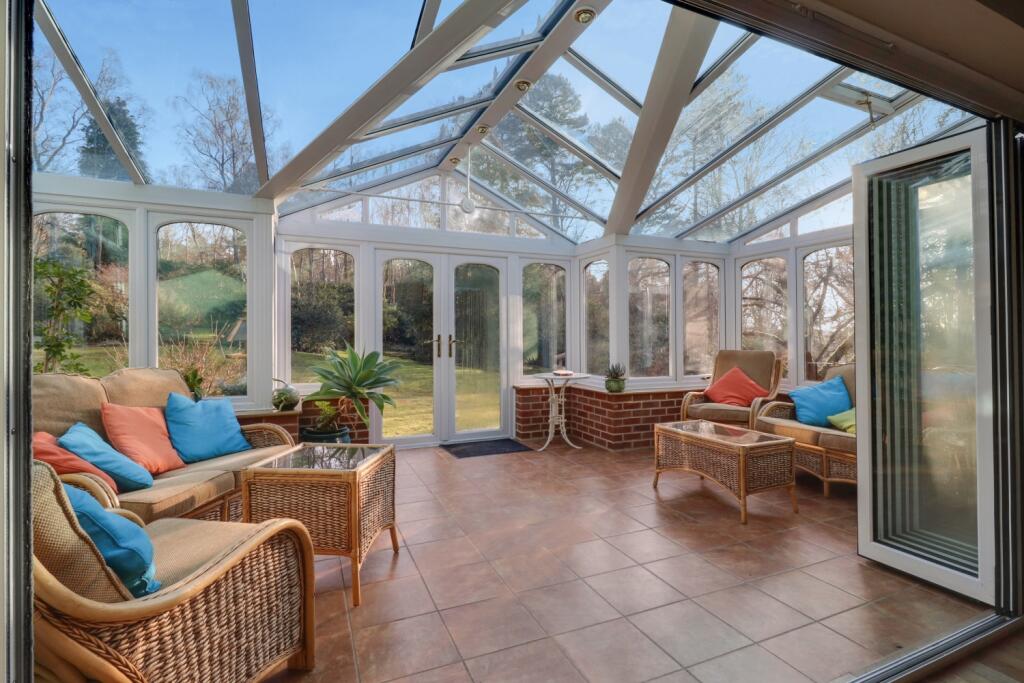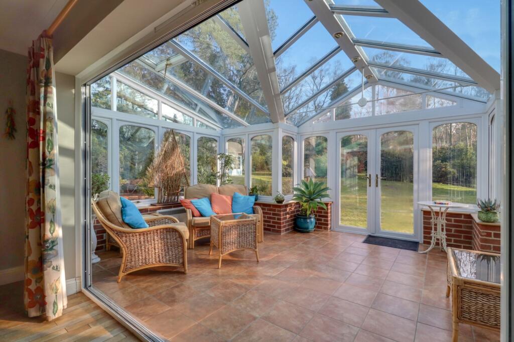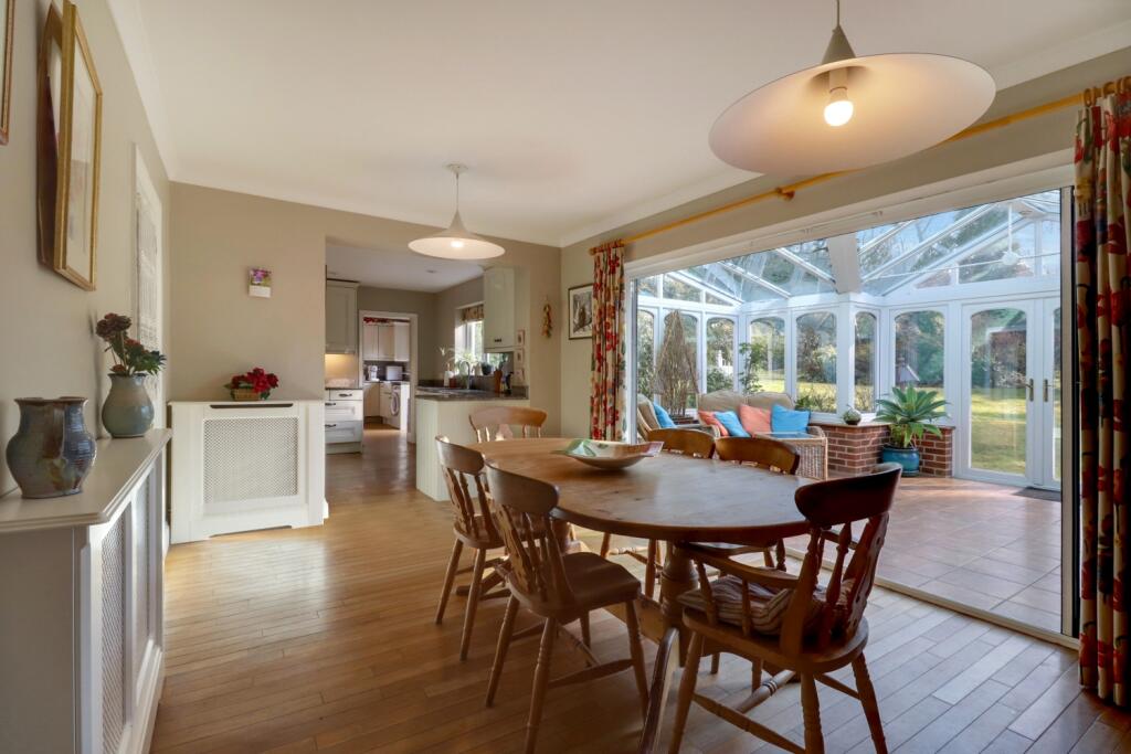 Based on the images provided, the property appears to be in good condition. The interior is well-maintained and shows evidence of recent modernisation, such as the kitchen and bathrooms. There is no visible evidence of significant repairs or renovations required. The property benefits from a large conservatory extension, adding significant living space.