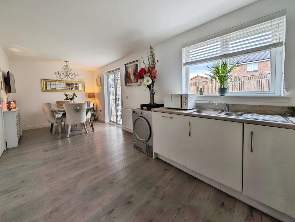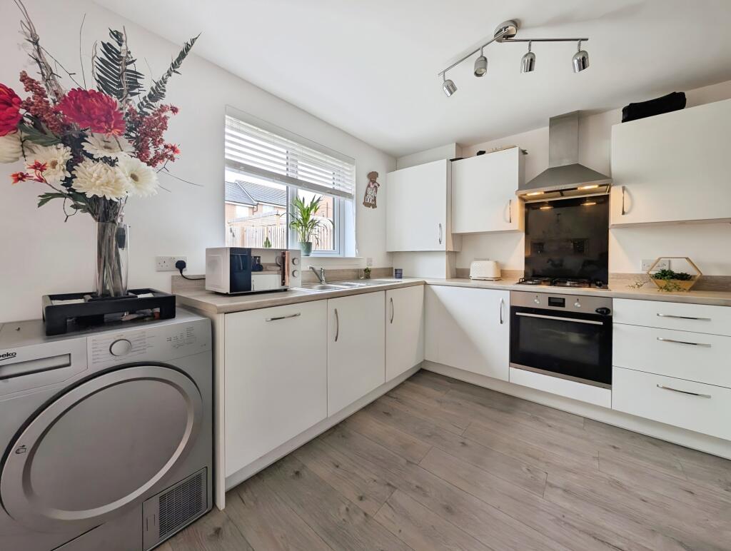 Stunning three-bedroom detached home in The Grange, Larkhall. Features a bright lounge with a media wall, a spacious kitchen/dining area with garden access, and a downstairs W/C. Upstairs offers a master with en-suite, two bedrooms, and a family bathroom. Includes a garage and driveway.