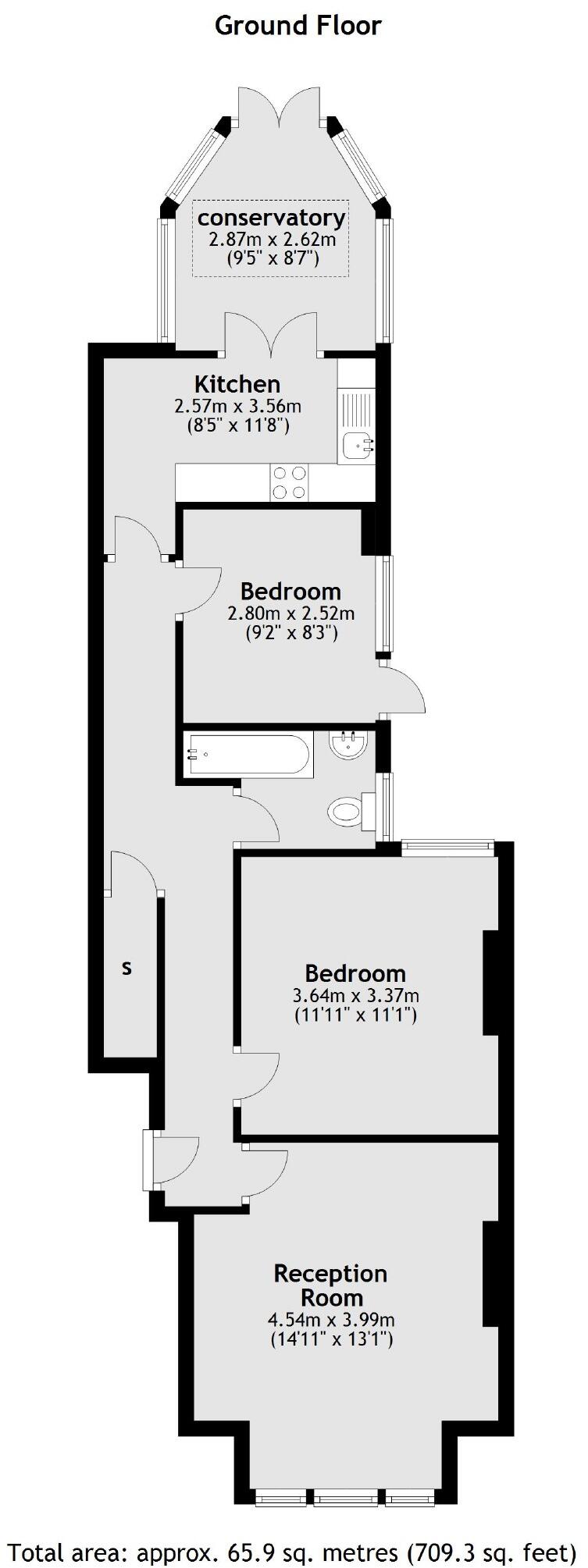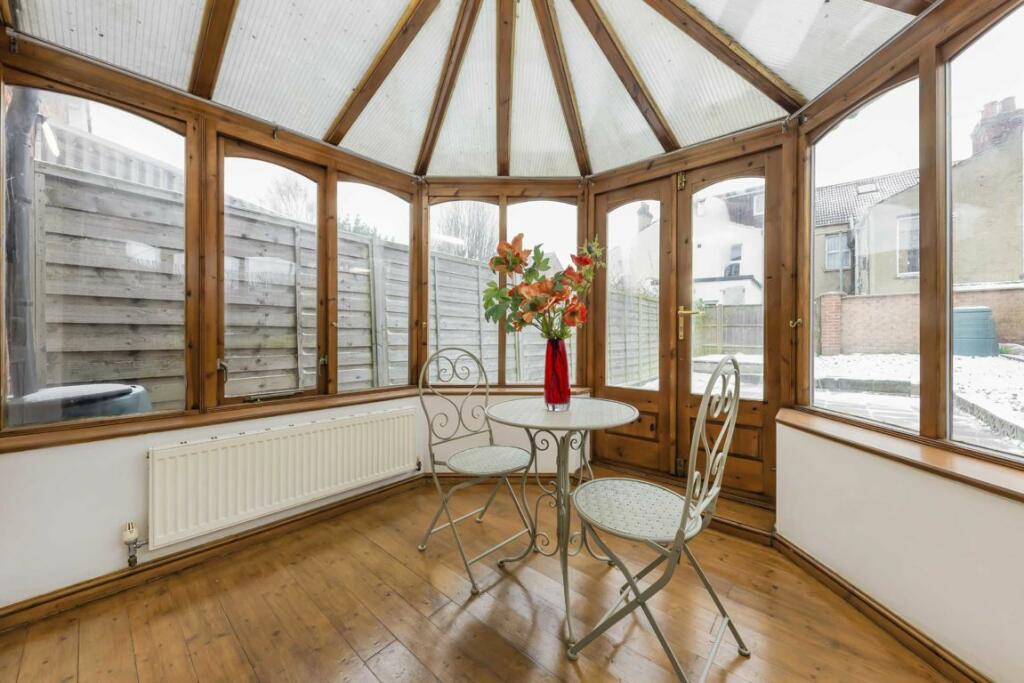 A spacious two bedroom flat on the ground floor of a Victorian conversion, with a south west facing garden. The property includes a large reception room to the front with a bay window, a separate kitchen, a conservatory, and is available chain-free.