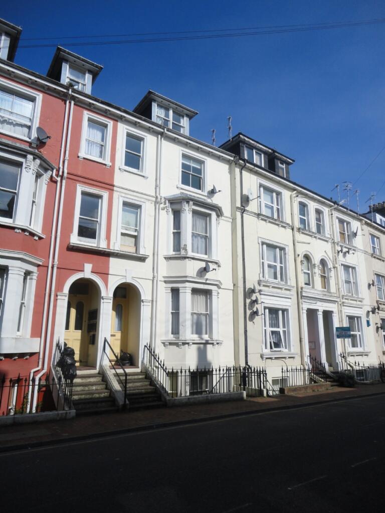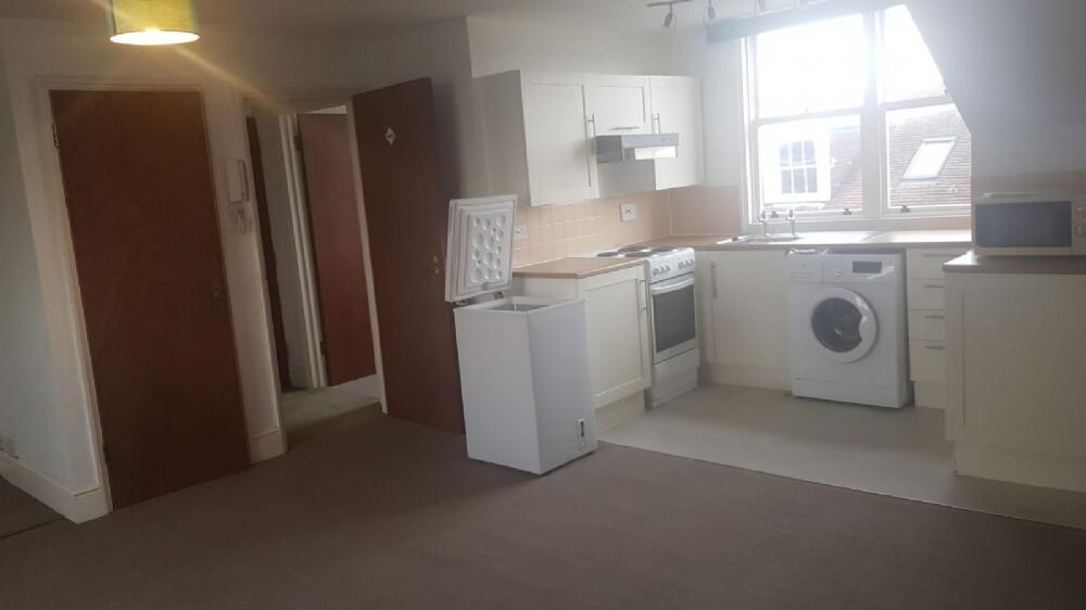 On offer is this light and airy top floor studio flat in the centre of town. Comprising of a large living room/bedroom with open plan kitchen. Storage cupboard off of main room. The kitchen has plenty of units for storage, an under counter fridge, a washing machine, and an electric cooker. The ba...