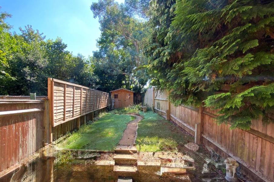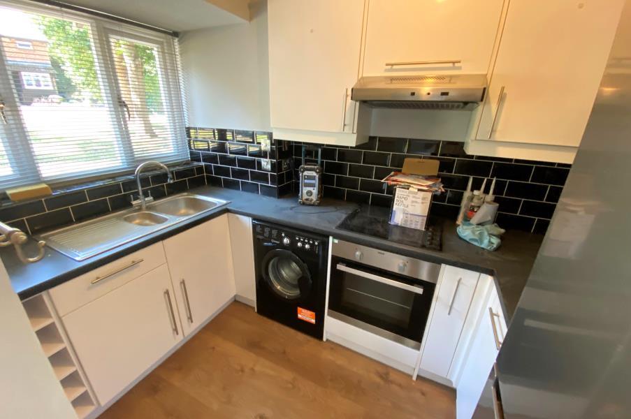 A newly refurbished one-bedroom house situated in a quiet location overlooking a green, featuring a larger-than-average enclosed garden. The property offers a modern kitchen, a bright living room with patio doors opening onto the garden, a double bedroom, and a contemporary white bathroom.