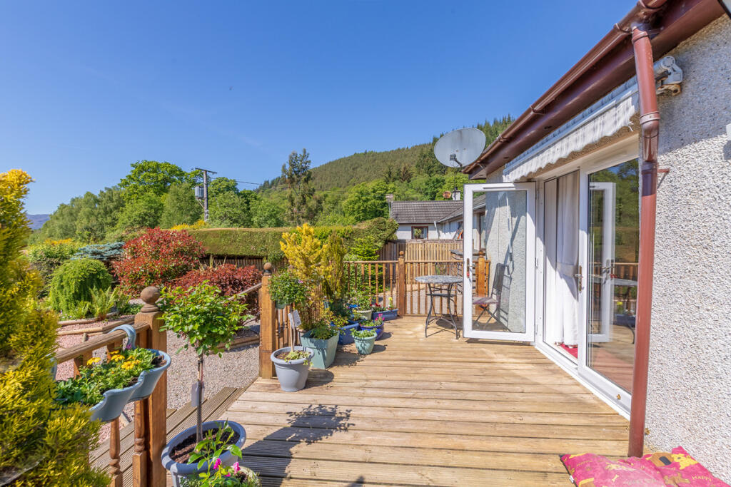 The property is a well-maintained semi-detached bungalow located in a peaceful area of Strathpeffer, in the Highlands of Scotland. The images show a modern kitchen and bathrooms, spacious and bright living areas, and a pleasant, well-maintained garden with a decked patio area. The list price may be reasonable given the apparent good condition and presence of a garden, though further information on square footage is needed for a conclusive assessment. A nearby comparable property is listed at a significantly higher price.