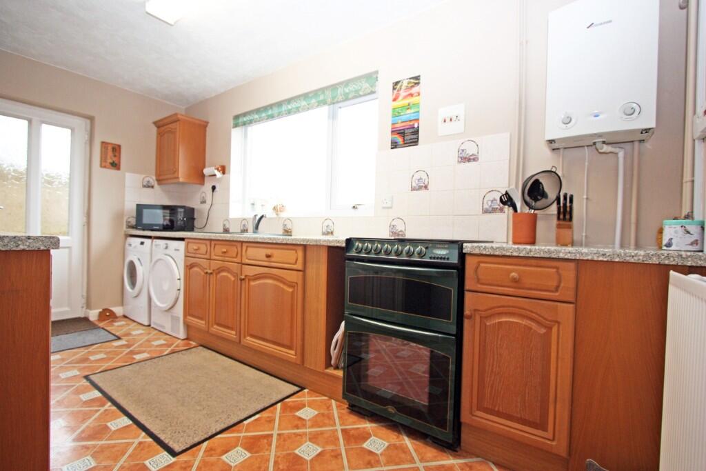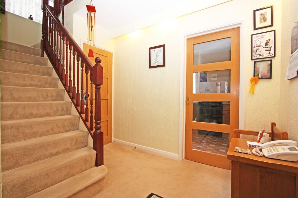 A spacious three bedroom detached house set on a large plot with far reaching views to the rear and is situated in a sought after cul-de-ac location, a short level walk from the High Street. Driveway parking & Garage with EV charging point. Hall, cloakroom, 2 reception rooms, re-fitted bathroom.