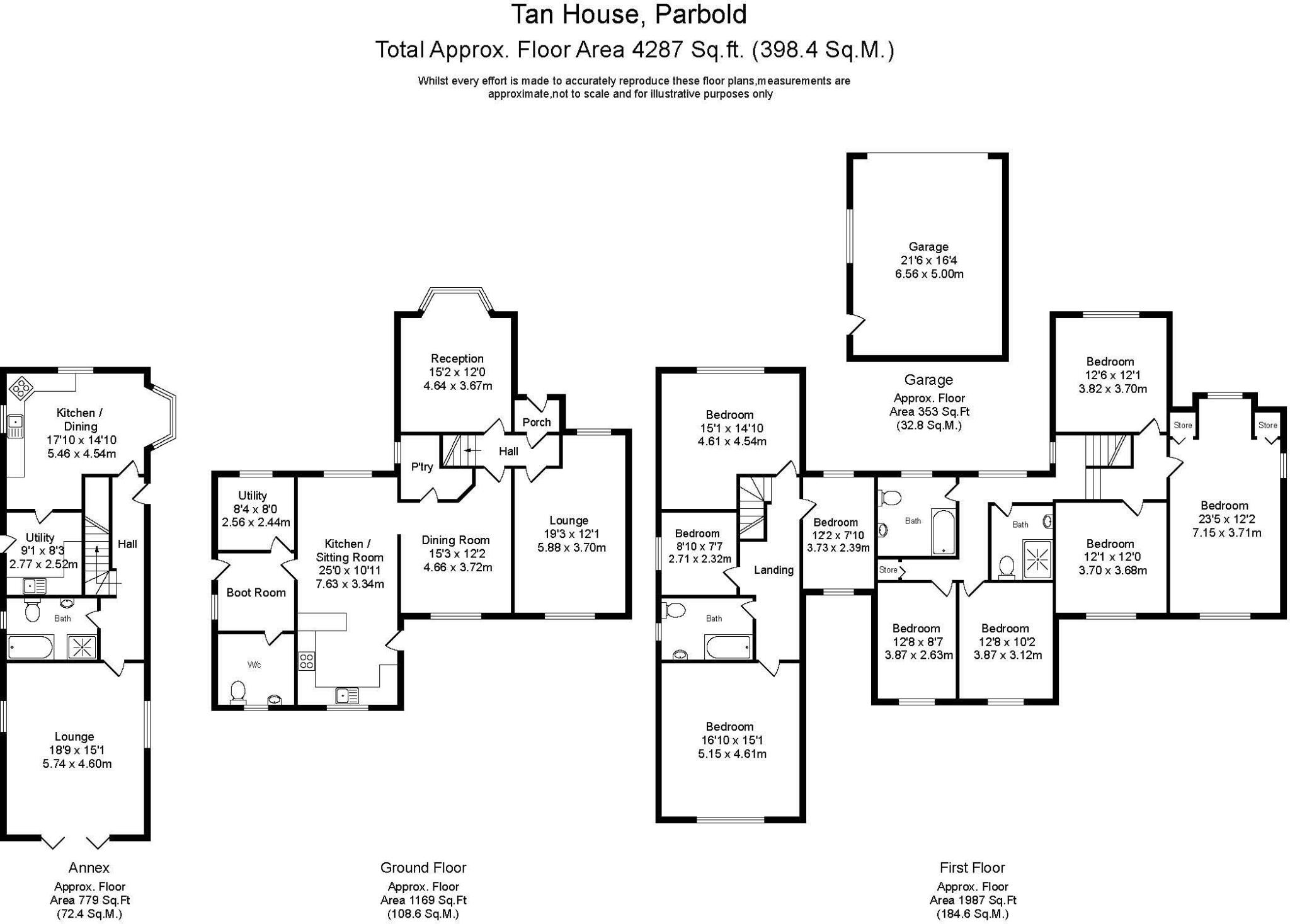 Land: The property boasts a substantial plot size of 4,287 square feet, offering ample outdoor space. Images reveal a well-kept lawn, a greenhouse, and a detached garage, adding to the property’s appeal.
