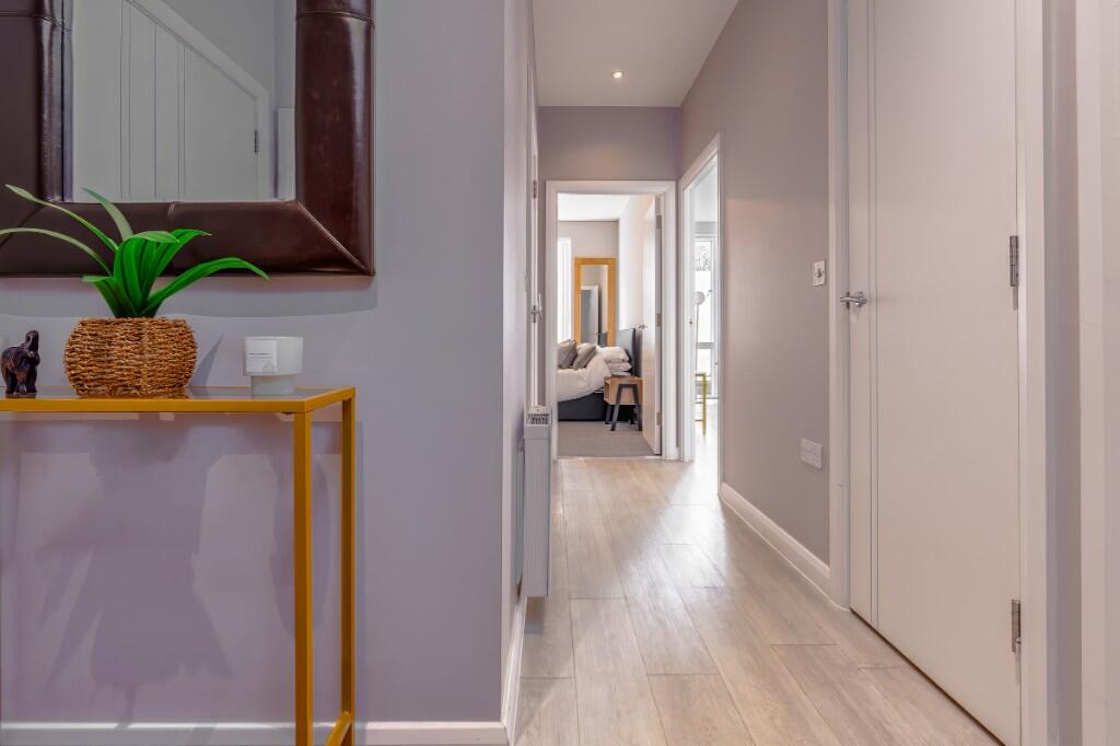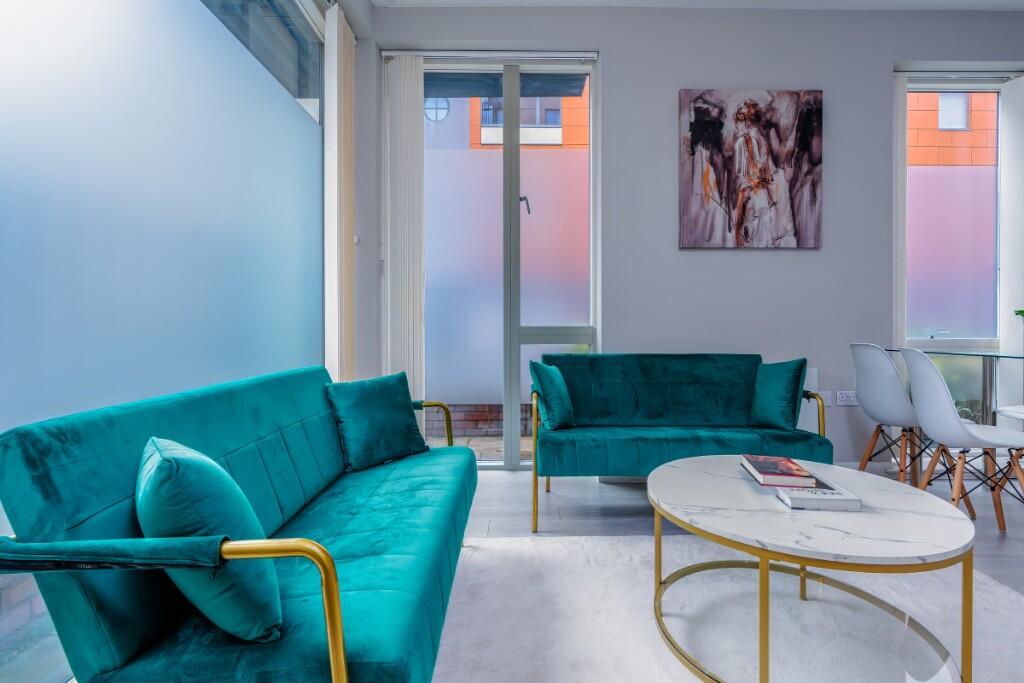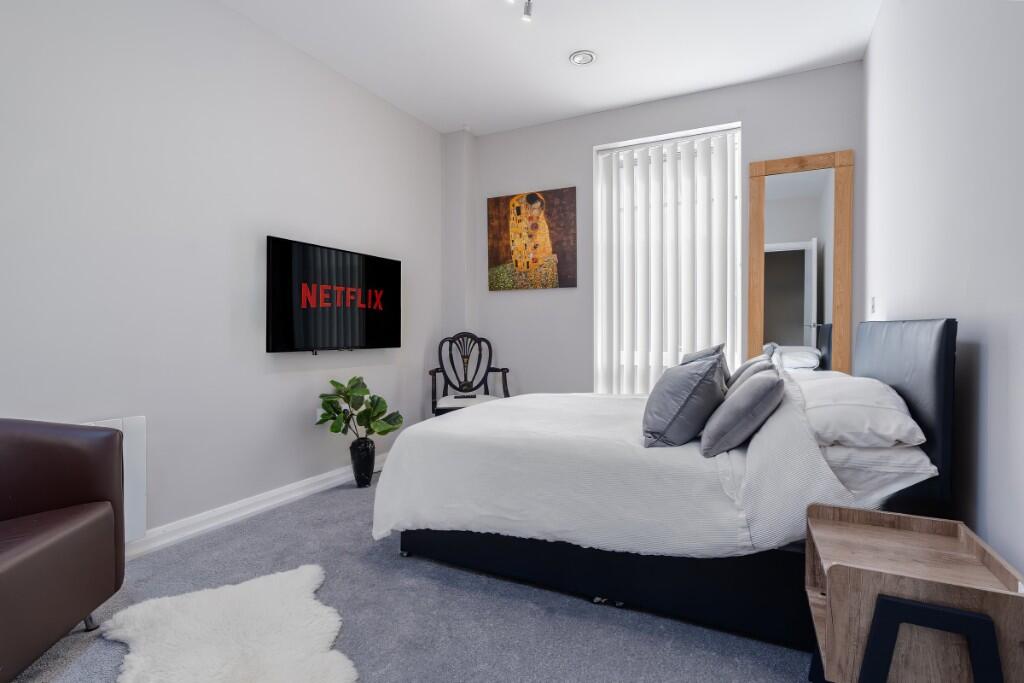 Modern one-bedroom apartment overlooking Portland Square Gardens, just minutes from Cabot Circus. Features a king-sized bed with a luxury mattress, a smart TV, fast Wi-Fi, and a fully equipped kitchen. Perfect for work or leisure, with an elegant dining area and excellent city access.