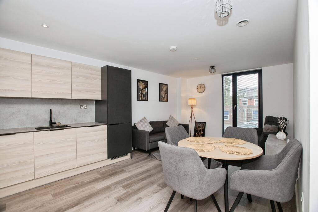 This is a modern two-bedroom flat located in Preston City Centre. The property appears to be in good condition, with a modern kitchen and bathroom. The flat is located close to local amenities, schools and transportation links. The lack of private outdoor space may be a drawback for some buyers. The price seems reasonable compared to average property prices in the area, but without the square footage, it’s difficult to determine the exact value.