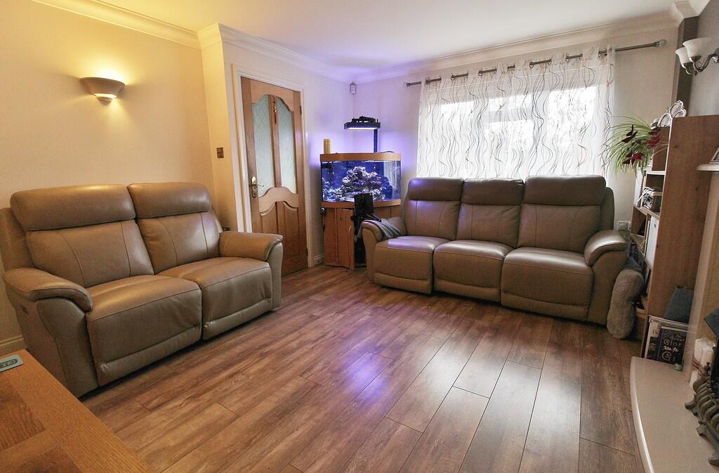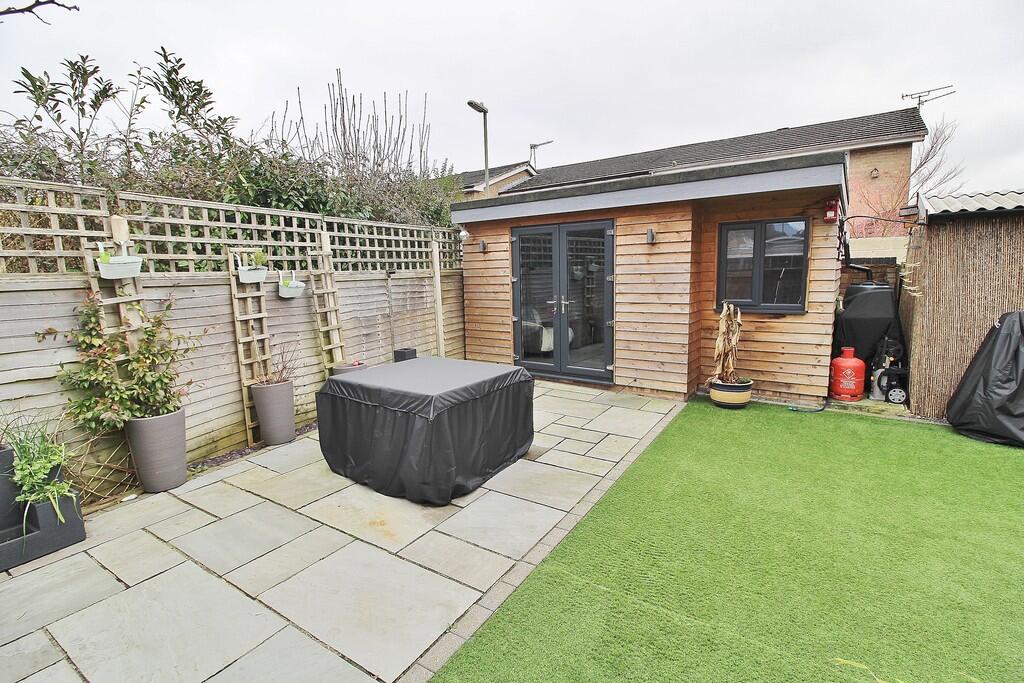 The property benefits from a notably attractive garden, which is exceptionally well-maintained and features several appealing landscaping elements including artificial turf, paving, a garden shed and potentially a hot tub. This increases the overall desirability of the property. The interior presents a pleasant living space, showcasing a contemporary kitchen, conservatory, and what appears to be a recently added office structure in the garden.