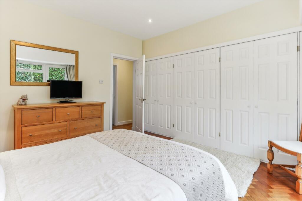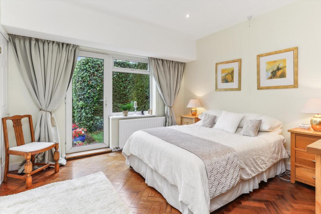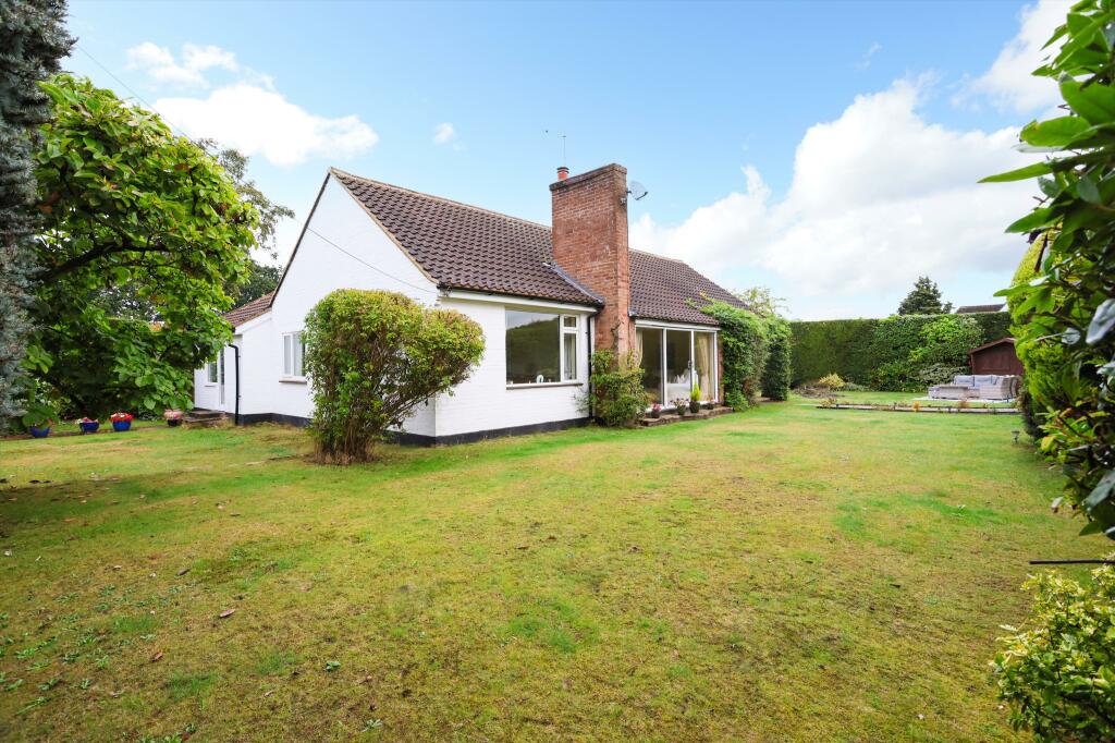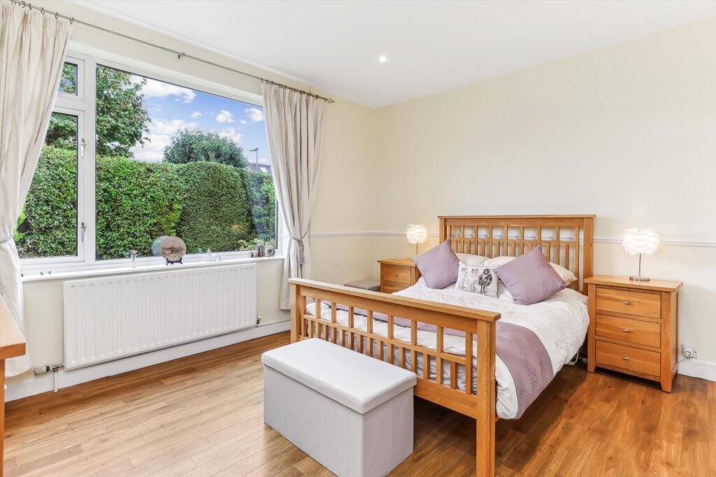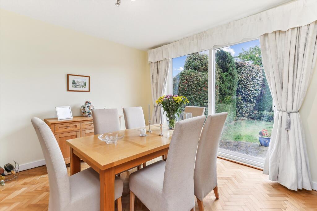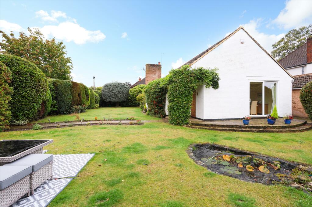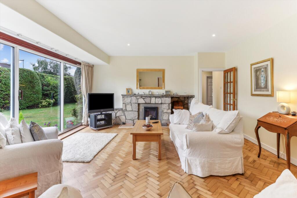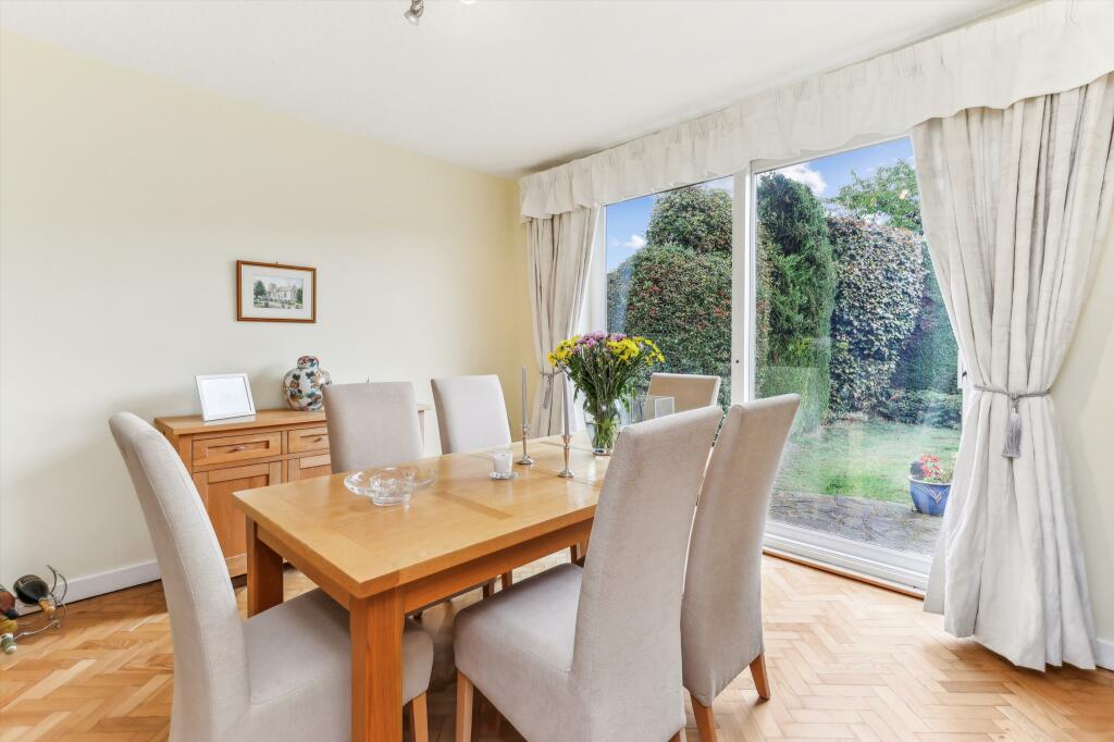 This property is a bungalow located on Rydens Avenue in Walton-on-Thames, Surrey. The location is highly desirable, given its proximity to excellent schools like Walton Oak Primary School and Three Rivers Academy, both with good Ofsted ratings. The area is also convenient to both Walton-on-Thames and Hersham railway stations, offering easy commutes. The visual assessment of the property reveals a well-maintained interior with a modern kitchen and spacious rooms. The parquet flooring throughout the house adds a touch of character. The house features a substantial mature garden with a pond; the garden is a key selling point.