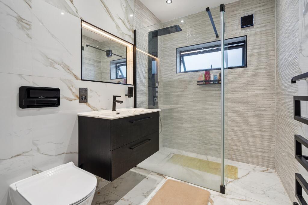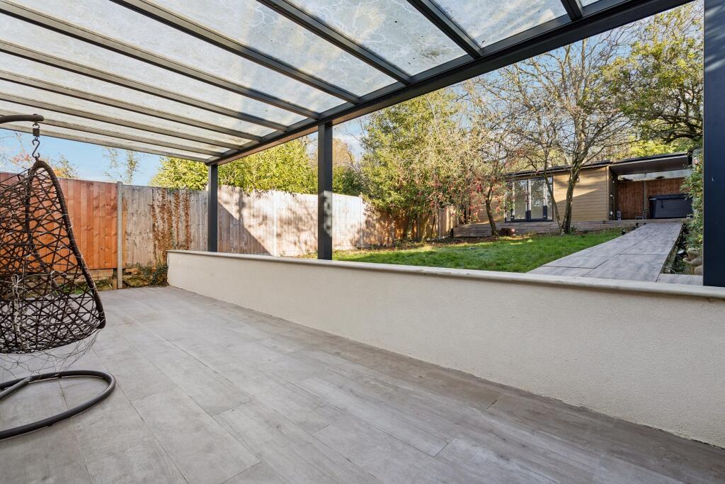 This is a detached bungalow located in Northwood Hills, Greater London. The property features four bedrooms and three bathrooms. The interior has been modernised, with a contemporary kitchen and bathrooms. The property includes a garden with a patio area and an outbuilding. The location is convenient for families, with several schools nearby. While the price is above the Northwood average, it aligns with similar properties in the immediate area. The property appears to be in good condition and ready for occupancy.