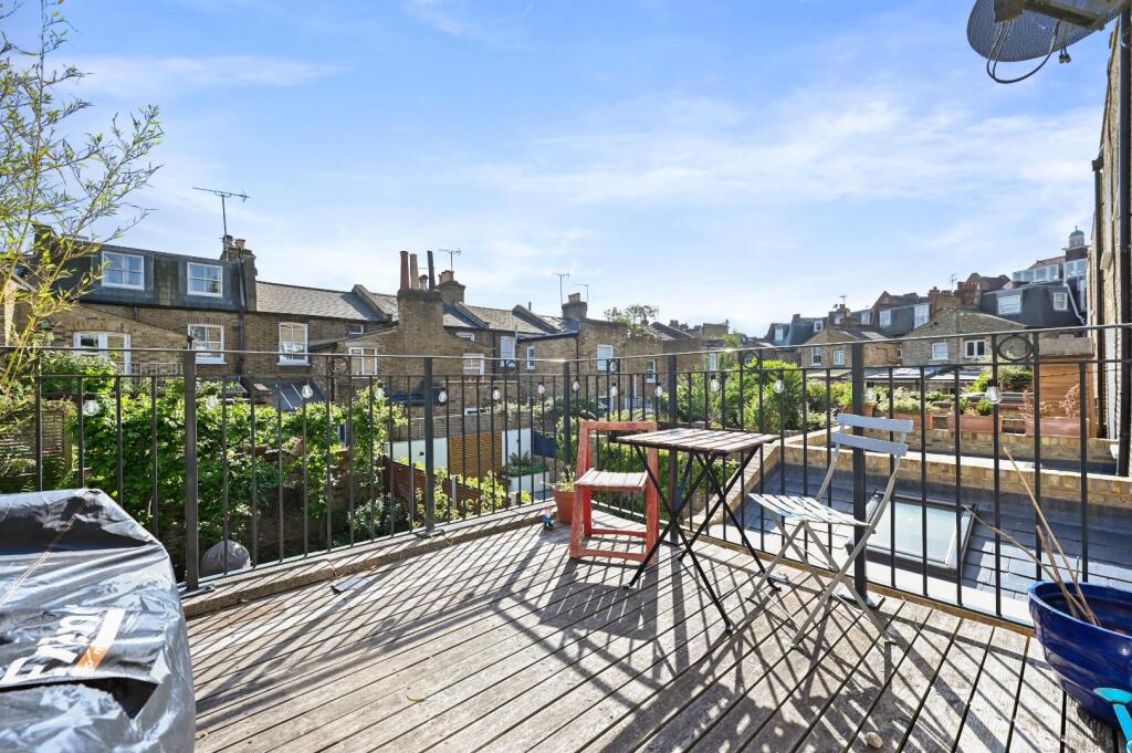 A charming 1 bedroom flat which occupies the raised ground floor of a handsome Victorian property with a fantastic southerly roof terrace. The generous reception to the front has a shuttered bay window and feature fireplace. The double bedroom has built-in wardrobes and a sash window with a south...