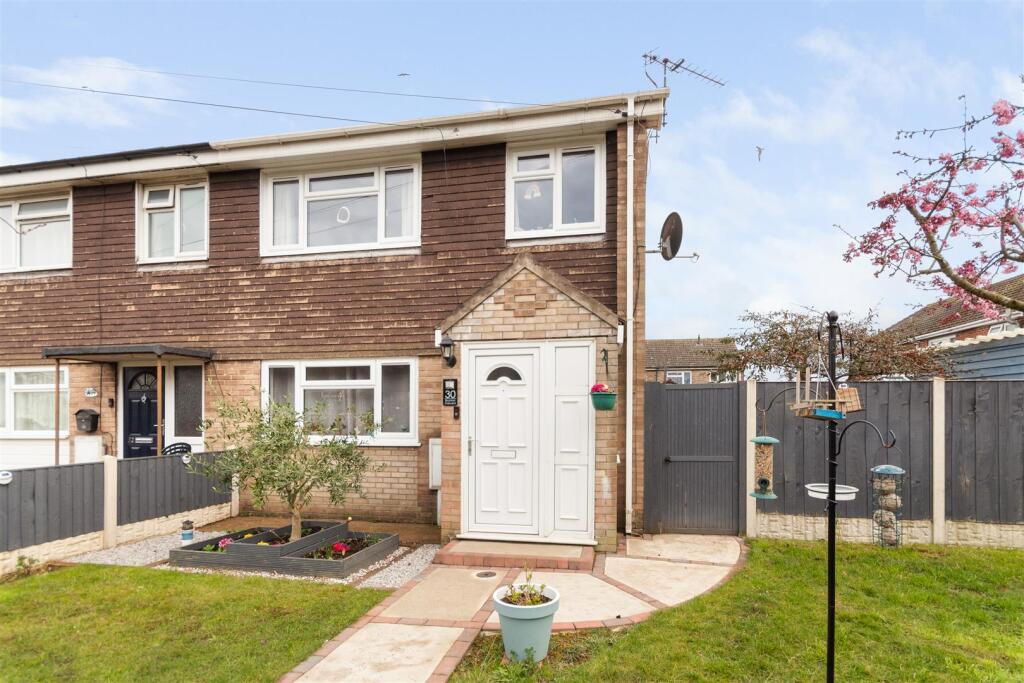 The property appears to be in good condition, with a recently modernised kitchen and bathroom. The images show a well-maintained interior and exterior. The garden is relatively small but well-maintained, including a shed and a swing set.