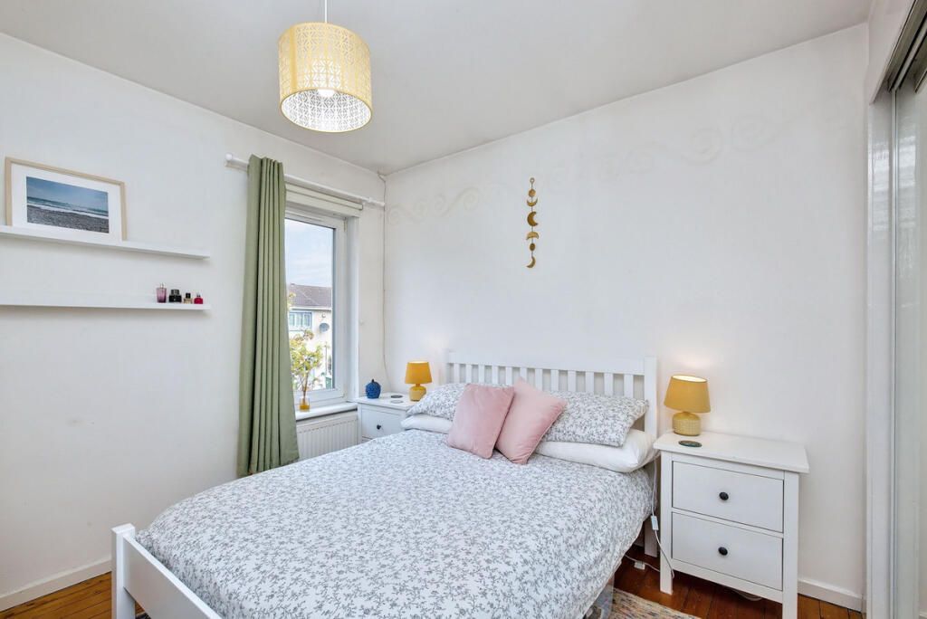 The well-presented home comprises a sunny double-aspect kitchen with fitted units, a spacious living room, a large double bedroom with a built-in mirrored wardrobe, and a modern family bathroom with a shower-over-bath