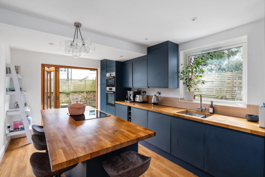 This three-bedroom semi-detached house located on St Leonards Road in Hove, Brighton and Hove, is presented in excellent condition. The property has clearly undergone significant renovations, boasting a stylish and modern interior. The kitchen is particularly striking, with contemporary cabinetry, a large island, and integrated appliances. Bathrooms also appear to be recently updated. The interior décor is modern and well-executed, creating a comfortable and attractive living space.