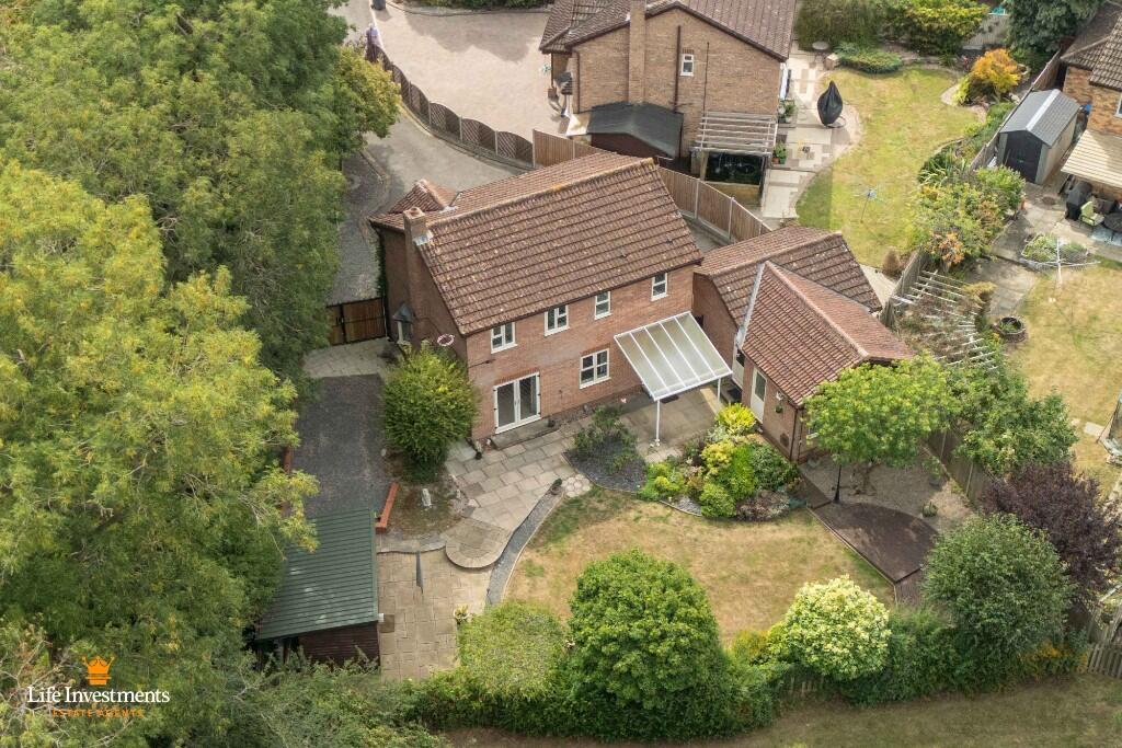 A beautifully situated for bedroom detached family home located at the end of a cul de sac on a larger than average plot that adjoins open parkland. Detached double garage, workshop or home office, off street parking with a sizeable tarmac driveway to both sides of the house. No onward chain.