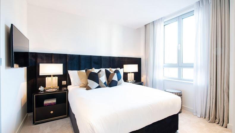 A luxurious interior designed two-bedroom 3rd floor apartment set over 763 SqFt. comprising a large open-plan reception room leading onto a private balcony.