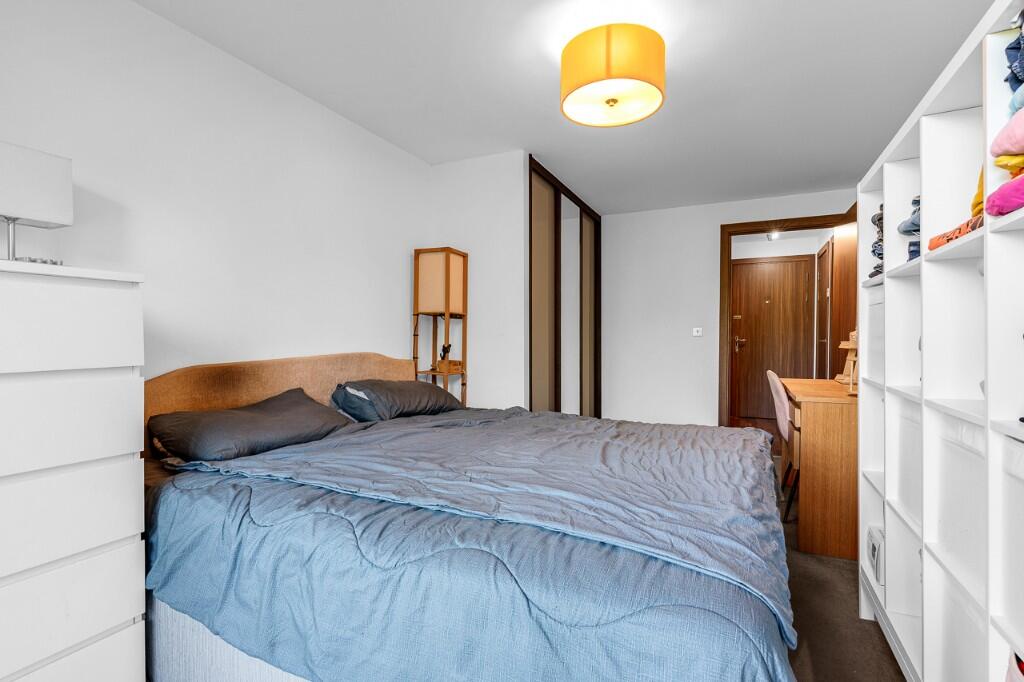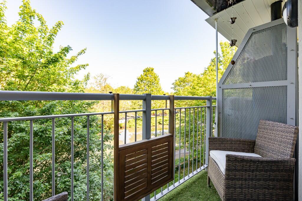 The apartment itself appears to be in excellent condition, with a modern kitchen and bathroom. The images show a well-maintained property with contemporary fixtures and fittings. There is also a small balcony overlooking a canal, offering a pleasant outdoor space.