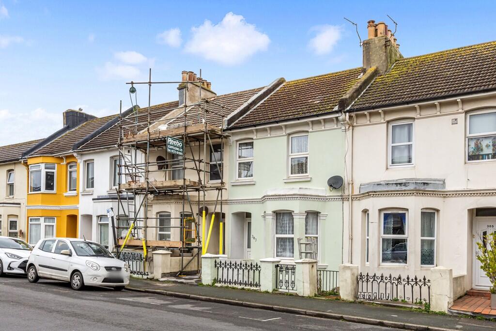 This property is a three-bedroom terraced house located in Queen’s Park Road, Brighton. The location benefits from being close to several primary schools with good Ofsted ratings, including Elm Grove Primary School and St Luke’s Primary School. Transport links are also relatively convenient, with several train stations within a reasonable distance. The property itself appears to be in need of some renovation, as evidenced by the scaffolding visible in the exterior photos. While the interior photos show a lived-in space, there are signs of wear and tear that would likely require attention. The property includes a small, enclosed rear garden. Considering the average price per square foot in the area is £489, and this property is listed at £545,000 with a size of 1,553.34 sqft, the price seems slightly above average but not unreasonable given the location and the potential for increased value after renovation. However, the lack of plot size information makes it difficult to fully assess the land value.