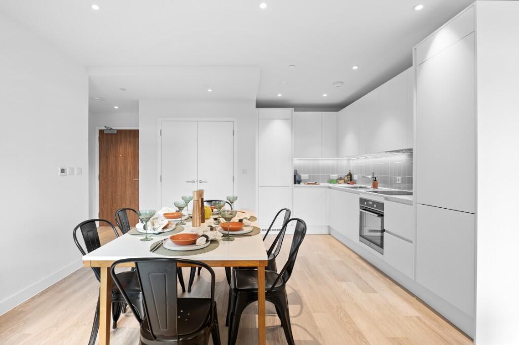 This is a modern one-bedroom apartment located in Southall, offering good transport links and proximity to schools. The apartment is in excellent condition with modern interiors. While it lacks a private garden, there are communal garden areas available. The price appears to be in line with the local market for similar properties.