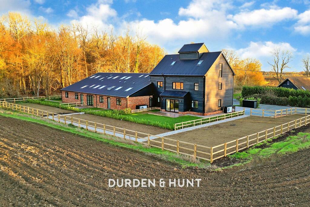 This property is a converted barn situated in the village of Carters Green, Matching, Essex. The photos show a modern, high-quality conversion with a contemporary interior and exterior design. The property boasts five bedrooms and three bathrooms, indicative of a substantial family home. Interior features appear to be high quality and modern, with neutral tones in the finishing. The exterior is attractive, benefiting from views over farmland, which offers a peaceful and rural environment. The available land could accommodate additional outbuildings or further landscaping. However, a precise plot size should be clarified. The location, while idyllic, is somewhat isolated. While nearby schools are noted to have good Ofsted ratings and there are transport links in the area; commuting to more populous centres may require a car. Overall, this property would appeal to buyers seeking a modern, luxurious home in a quiet, rural setting. The absence of information regarding the precise plot size and a scarcity of directly comparable local properties makes a definitive assessment of value difficult without further details.
