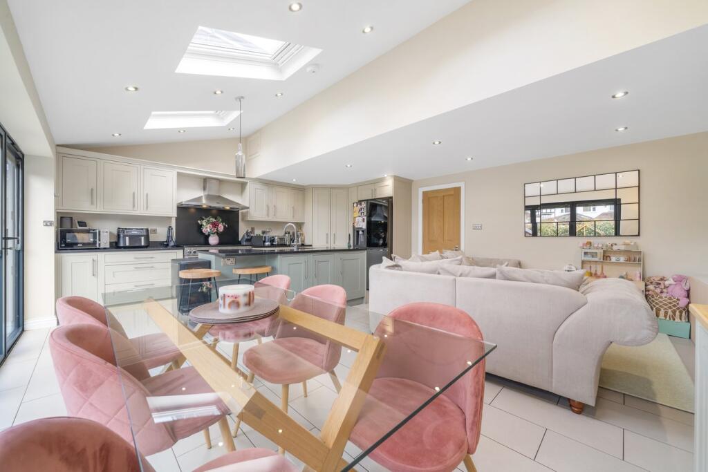 This property is a 4-bedroom, 2-bathroom semi-detached house located in Hayes, Bromley. The property benefits from a modern extension to the rear, creating a large open-plan kitchen/diner with bi-fold doors leading to the garden. The house appears to be well-maintained and presented to a high standard. There is also off-street parking. The location is convenient, with nearby schools (Hayes School rated Outstanding by Ofsted) and transport links (Hayes train station approximately 1.10 KM away). The plot size is 1,292 sqft. The list price is £775,000, while the average price for similar properties in the area is £718,780. The average price per sqft is £540 but this is based on limited data and may not be entirely representative of this particular property.