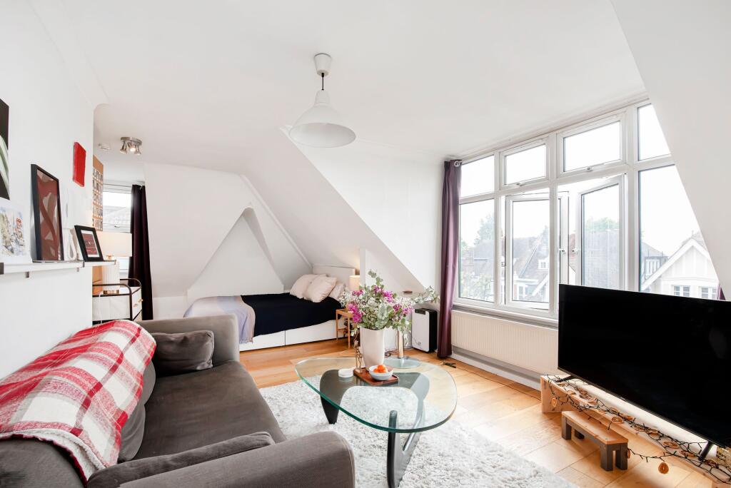 Immaculate top floor studio in period building with bright interior, modern bathroom, wooden flooring, and tranquil surroundings.