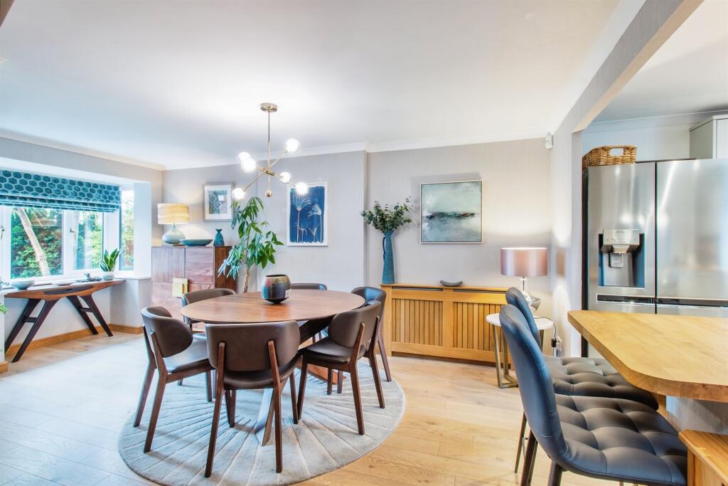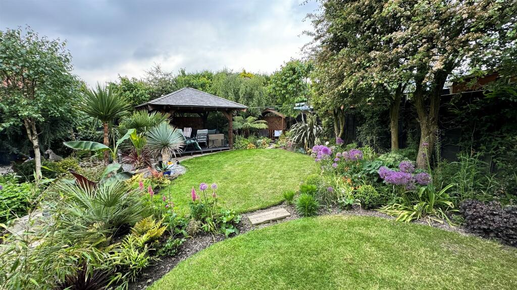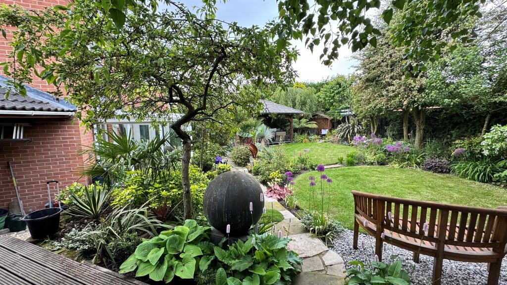 The exterior of the property is also appealing, exhibiting a neat and well-maintained front garden and a sizeable, professionally landscaped back garden, which features a pergola. The driveway and single garage provide ample parking. The relatively close proximity to local schools and transportation links adds considerable appeal for families.