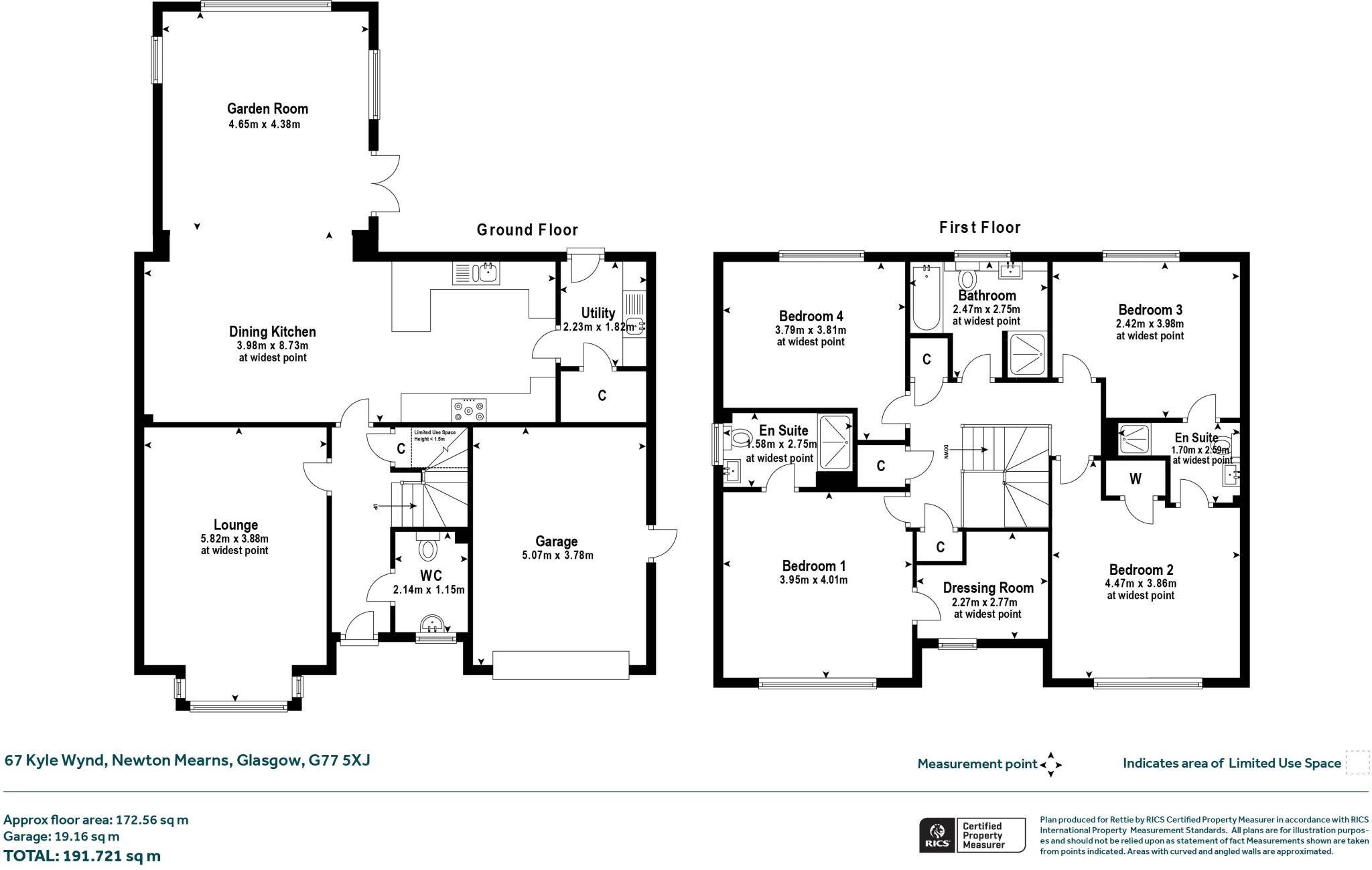 The property is a detached house located in Kyle Wynd, Newton Mearns, Glasgow, with a list price of £575,000. It has 4 bedrooms and 4 bathrooms, and covers 1,955.74 sqft with a plot size of 2,063.67 sqft. The average house price in the area is £430,226, with an average sqft of 1,234 and an average price per sqft of £348. Based on the images provided, the property appears to be in excellent condition, recently built or renovated to a high standard. The interior is modern and well-maintained, with a contemporary design throughout. The kitchen and bathrooms are modern and well-equipped. The property also benefits from a well-maintained garden. The location, Newton Mearns, is generally considered a desirable area in Glasgow. While specific information on nearby schools is not provided, the proximity to several ScotRail stations suggests good transport links. The property’s location within a new development adds to its appeal, suggesting a quiet and family-friendly environment. Considering the property’s condition, location, and size, the list price of £575,000 appears relatively reasonable compared to the average house price in the area. The property is significantly larger than the average house in the area, and its modern condition and desirable location justify a higher price. However, a direct comparison to similar properties is limited due to missing sqft data in the nearby listings.