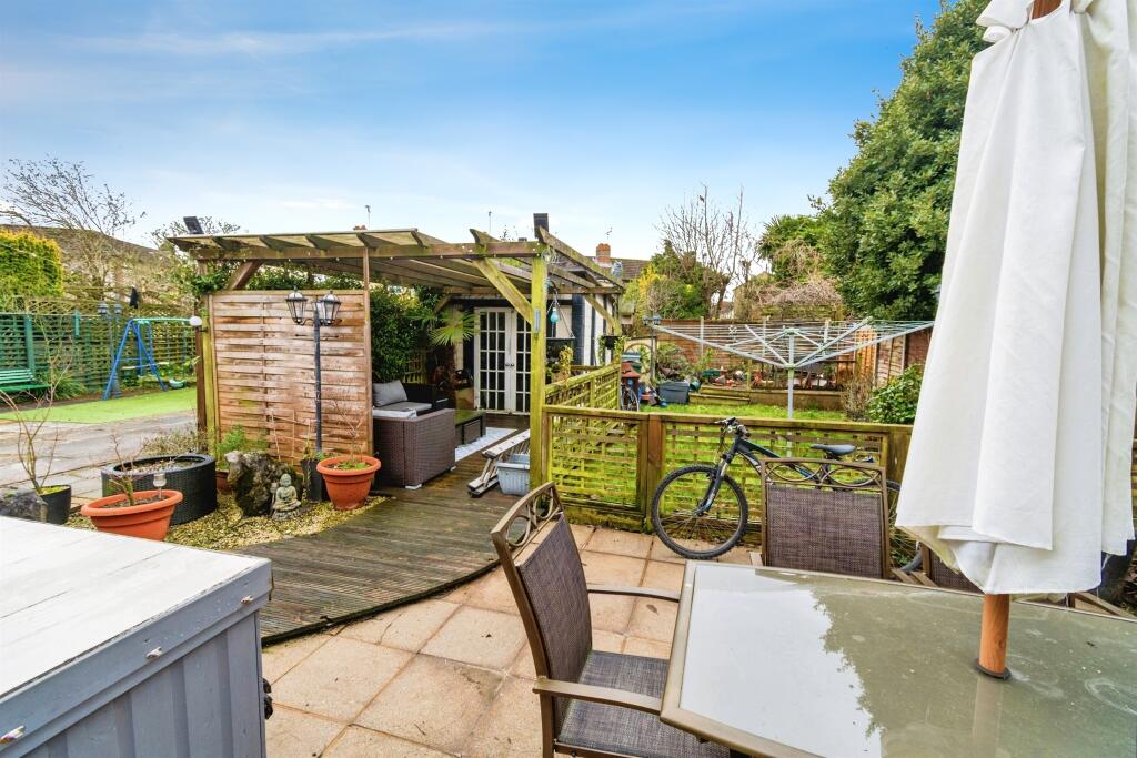 The property includes a garden, which is a desirable feature for many buyers. The garden appears to be of a reasonable size, with a patio area and space for planting. The presence of a shed and other garden features suggests it is well-used.