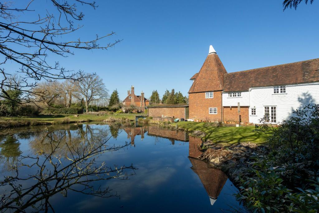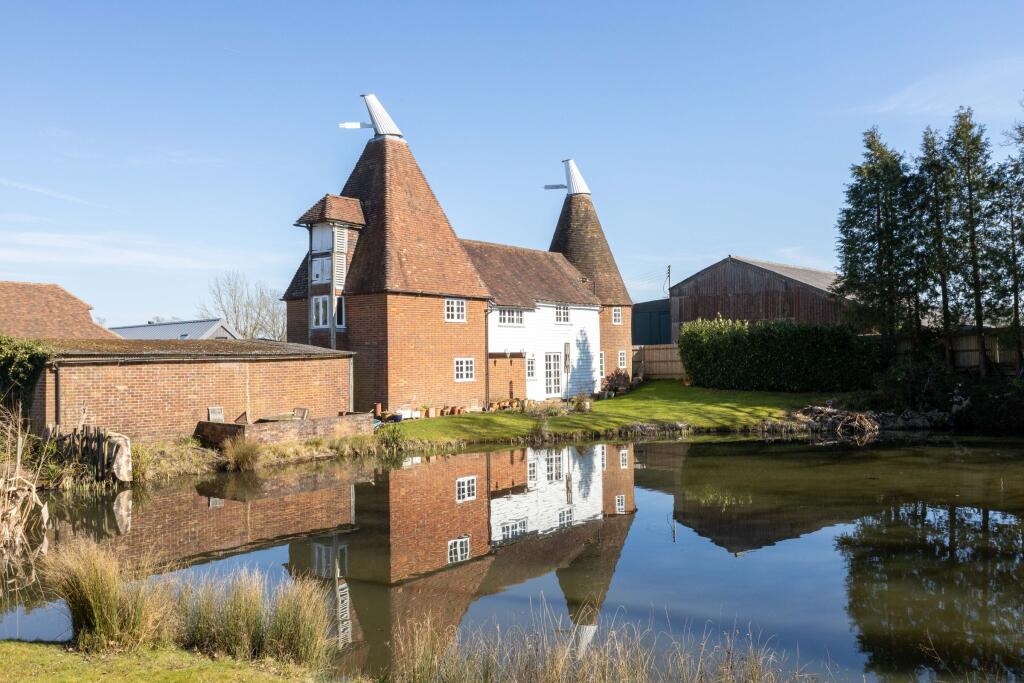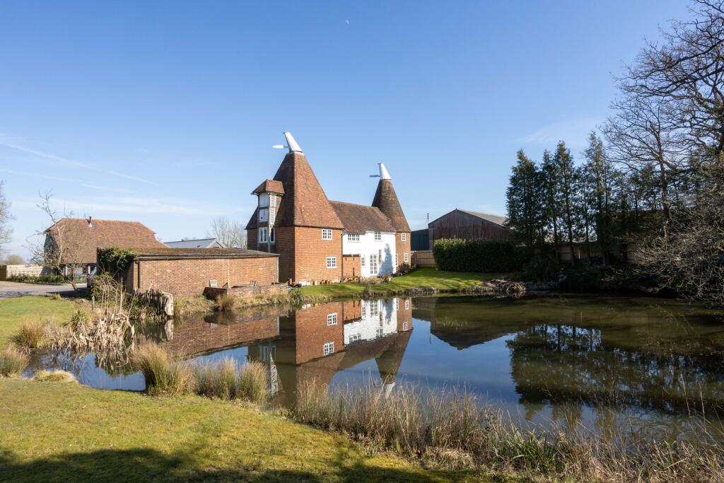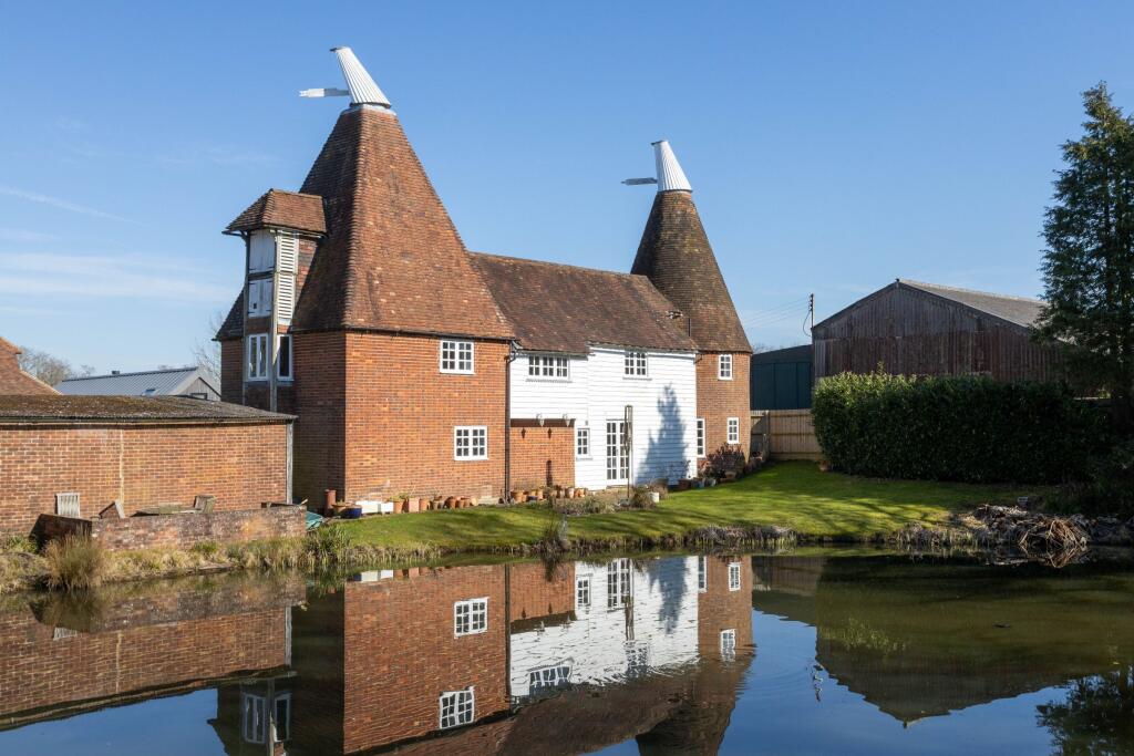 Grade II listed detached, well proportioned and attractive Oast with characterful 4 double bedroomed (all with ensuite), 2 receptioned accommodation with feature roundel fitted kitchen. Semi rural yet convenient location amongst mature gardens with a large natural pond. CSCA. Viewing is recommended.
