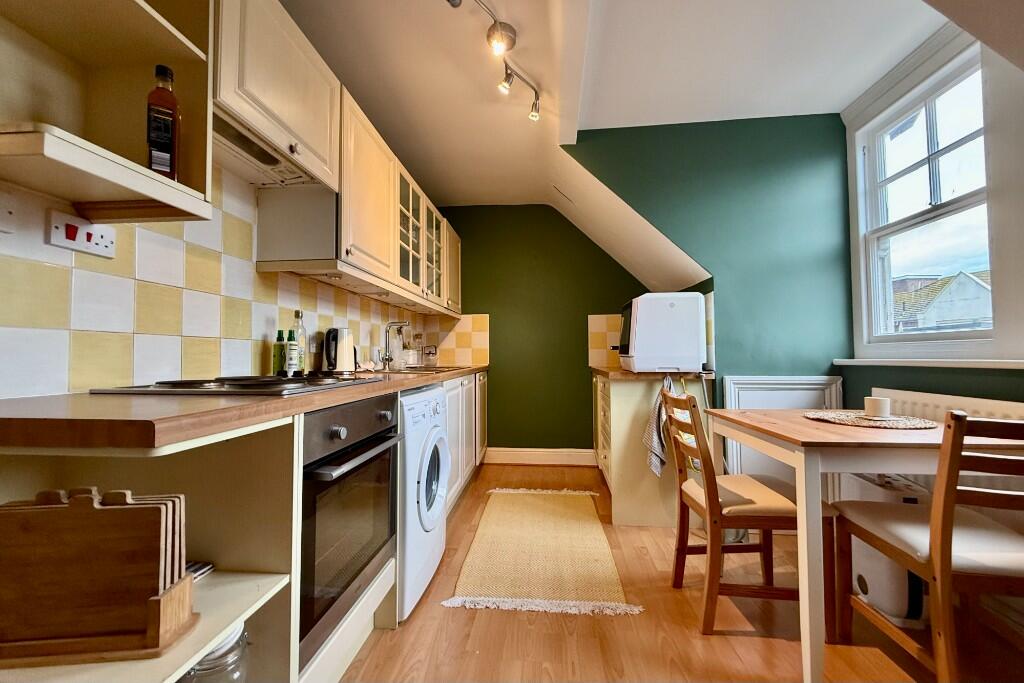 This one-bedroom, one-bathroom flat is located on Southfields Road in Eastbourne, a convenient location close to Eastbourne train station and several schools. The property is a top-floor apartment within a larger building. The interior is presented well in the photographs, featuring a relatively modern kitchen and bathroom. The living area is spacious and benefits from a feature fireplace. However, the property lacks a private garden or outdoor space. The external appearance of the buildings suggests it may be an older property, which may require some future maintenance. Whilst comparable properties in the area are available for a similar price the available data doesn’t provide sufficient information to determine if this is a strong price per square foot. The property is likely to appeal to first-time buyers or investors looking for a conveniently located flat in Eastbourne.