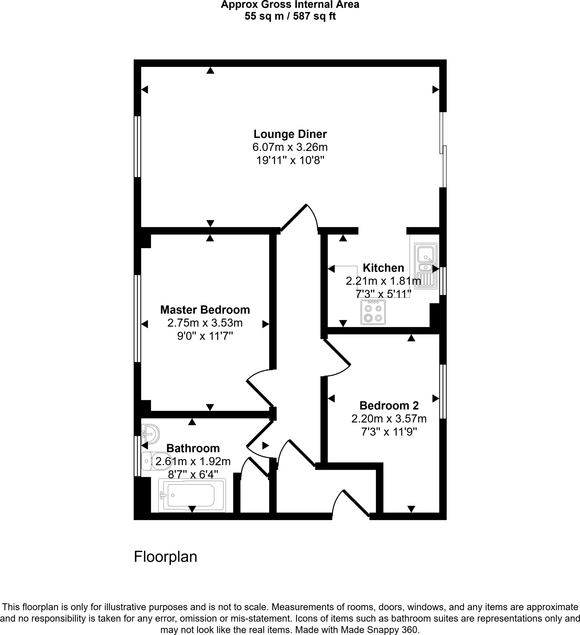 The property is a 2-bedroom apartment located in Chirton Dene Quays, North Shields. Based on the provided images, the apartment appears to be in good condition, with modern fixtures and fittings. The interior is clean and well-maintained. The kitchen and bathroom are in good order. The apartment benefits from a good-sized living area and two bedrooms with built-in wardrobes. However, there is no outdoor space included.